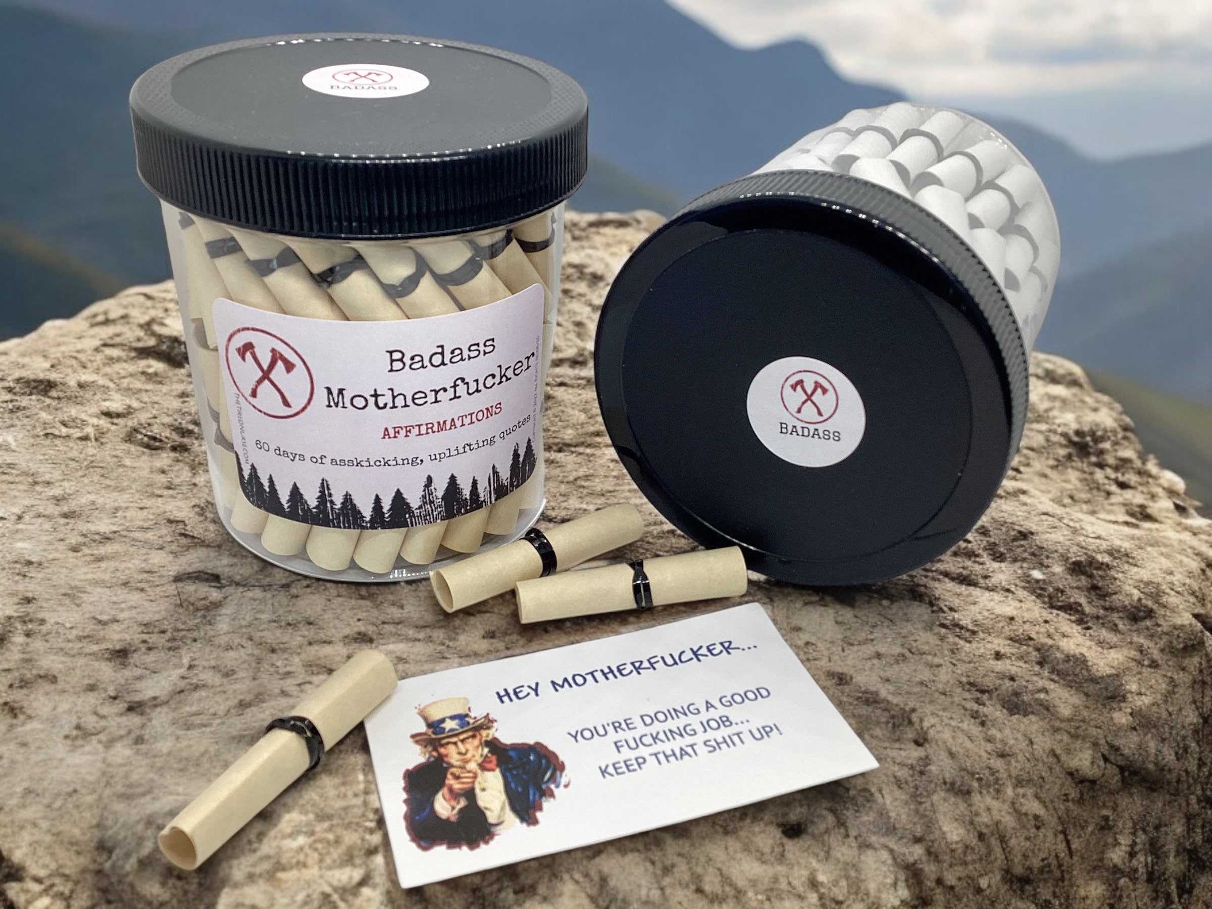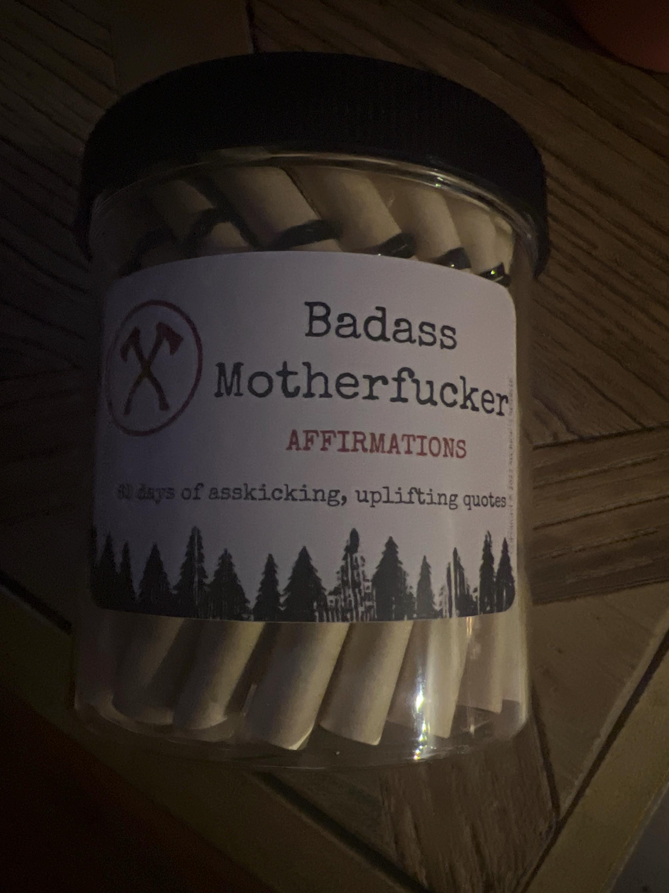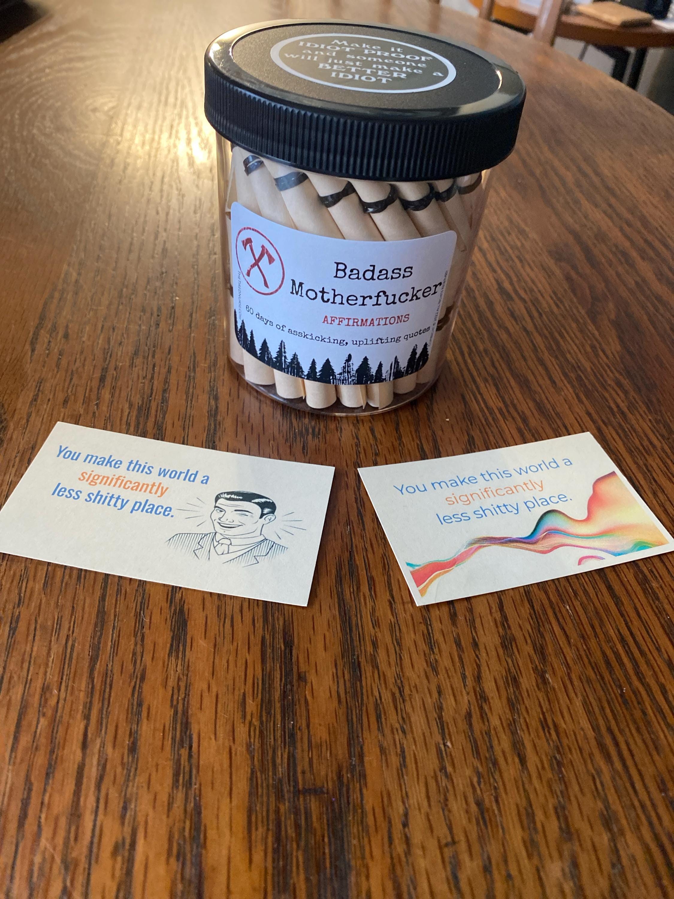 Badass Motherfucker Affirmation Jar: The ultimate source of irrefutable empowerment and confidence for men who own their power and embrace their inner badass! This jar contains 60 carefully selected hardcore affirmations designed to motivate, uplift, and kick some serious ass on a daily basis.