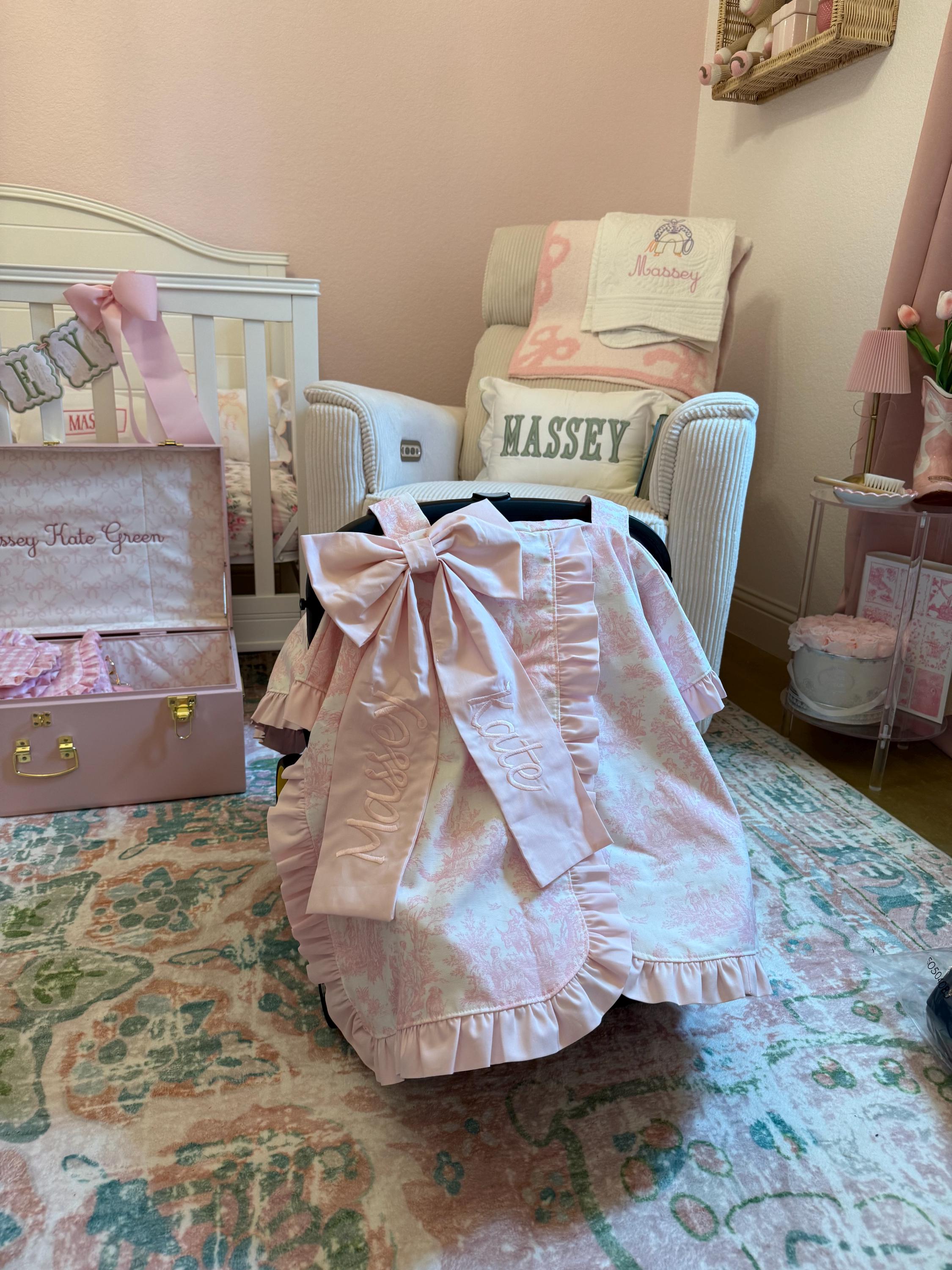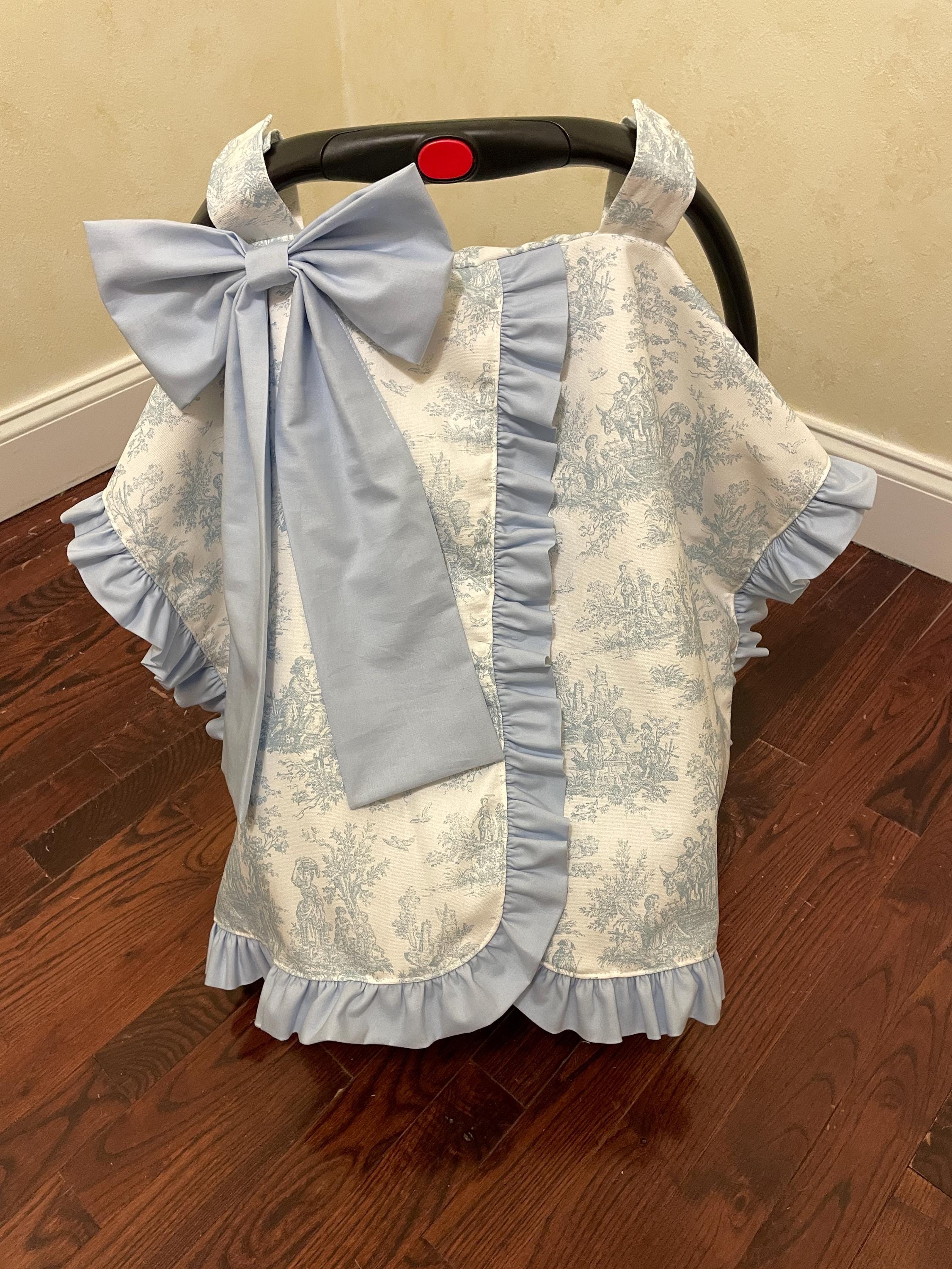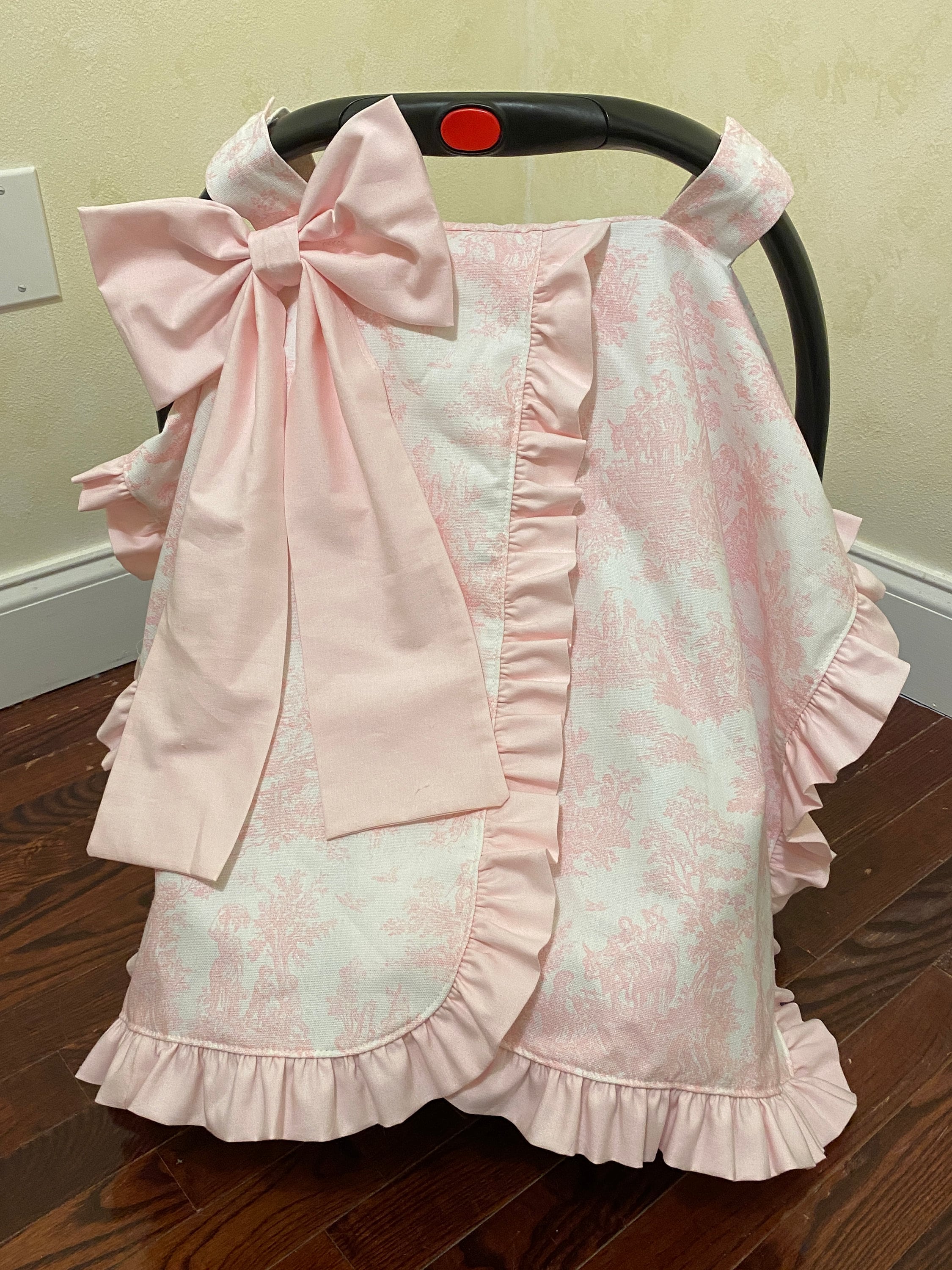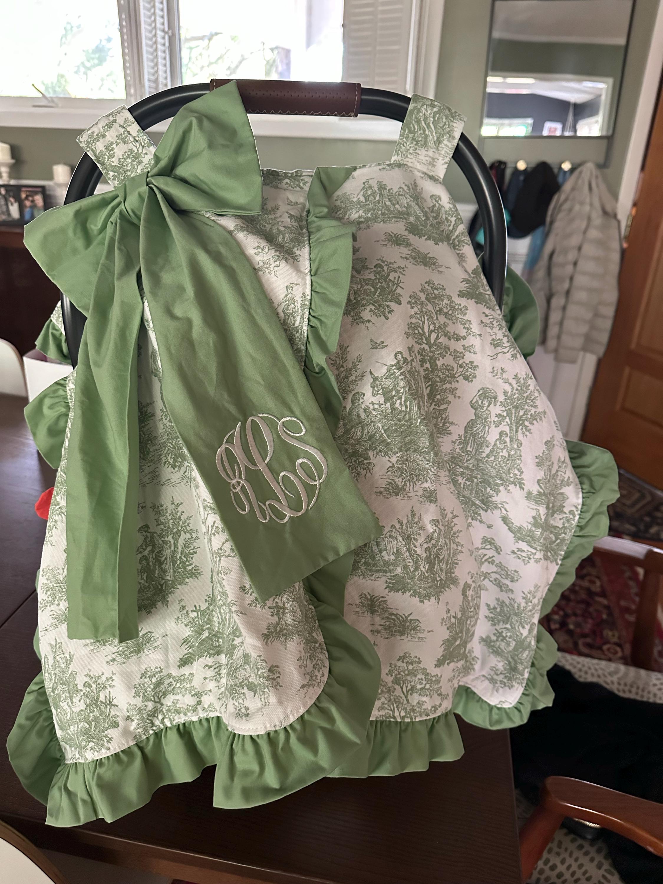 This car seat canopy features a chintz fabric in the color of your choice with a matching cotton ruffle and bow. You can personalize it with a three letter monogram or name on the bow. Contact us for custom designs.