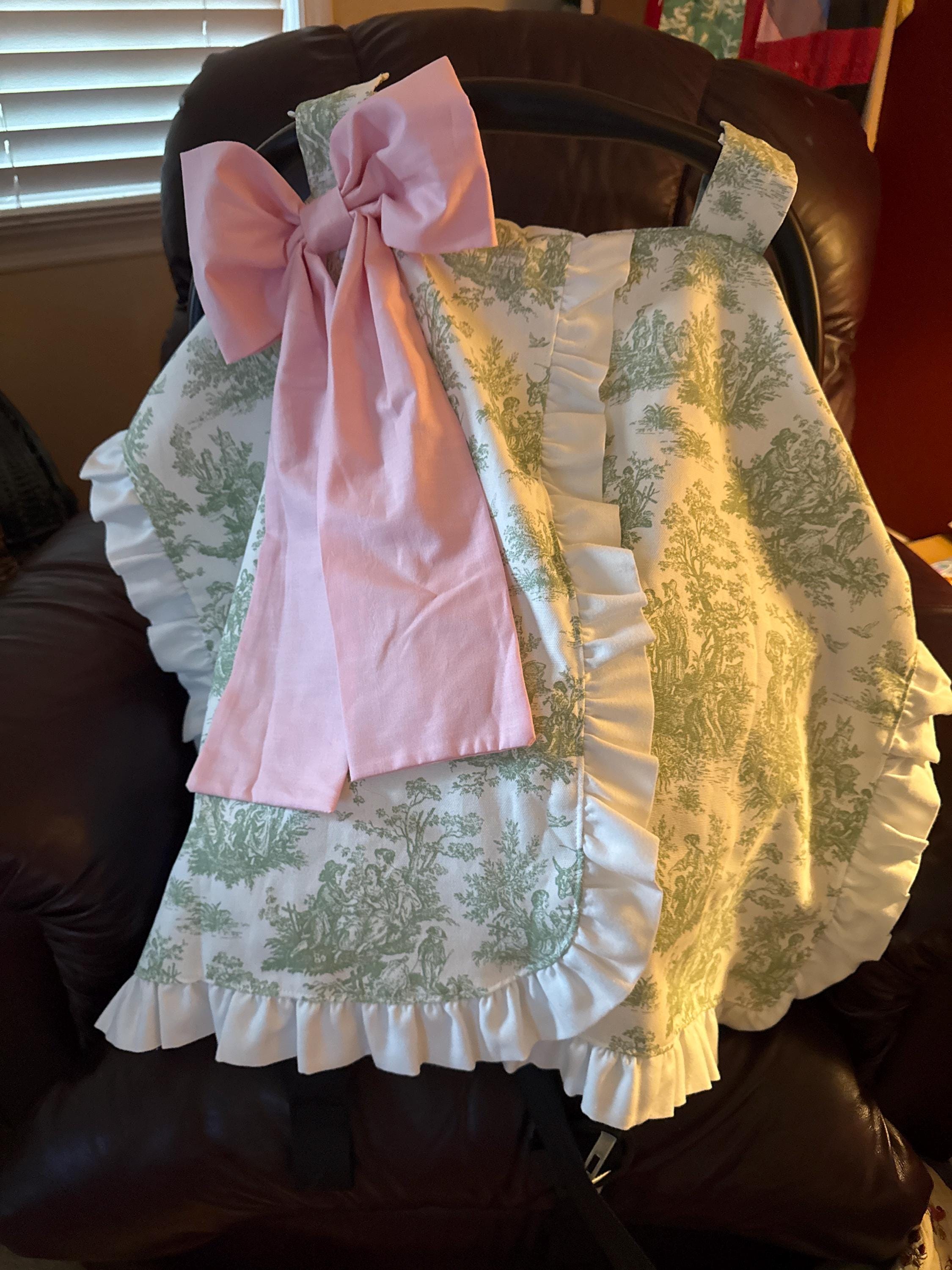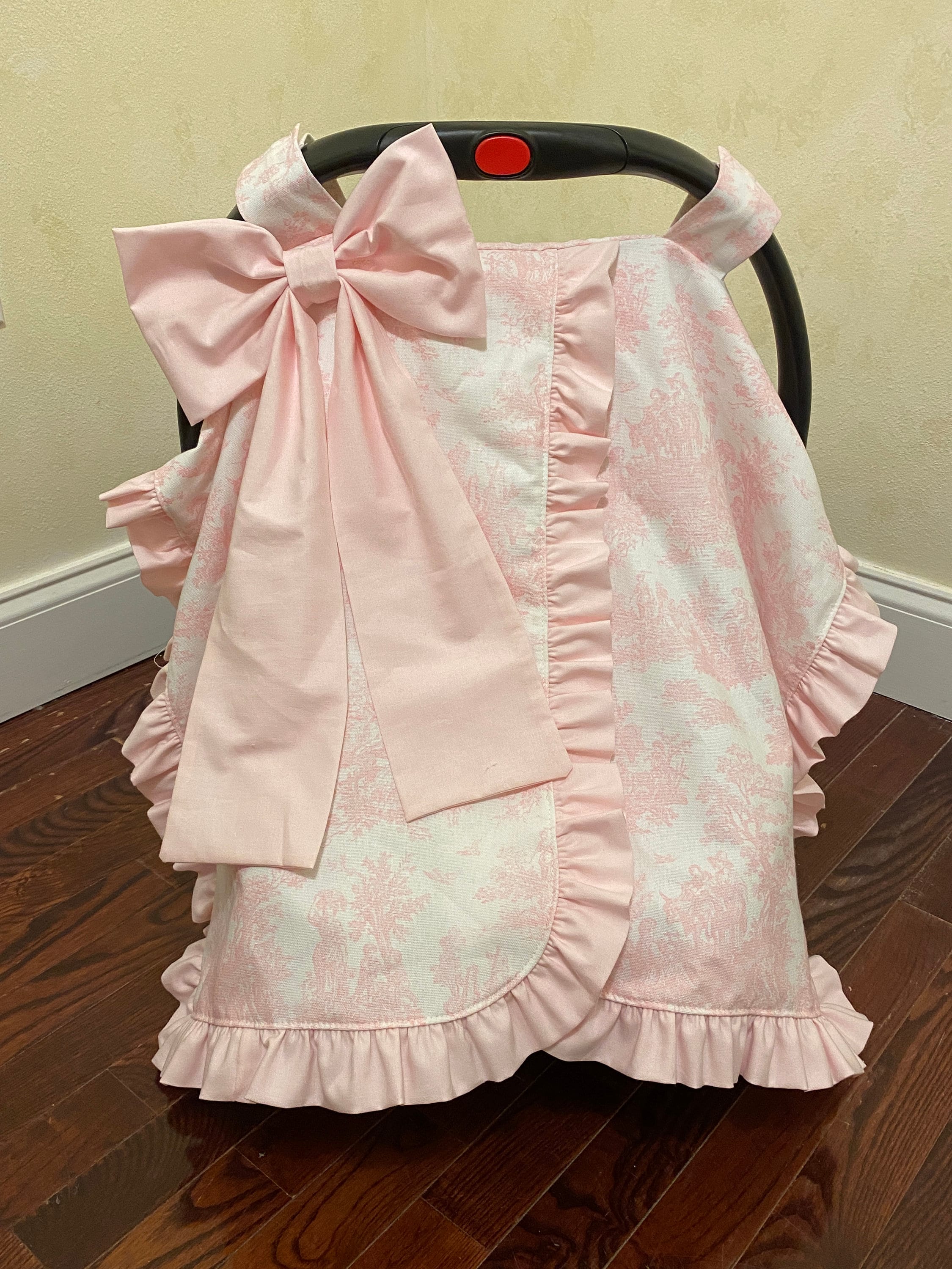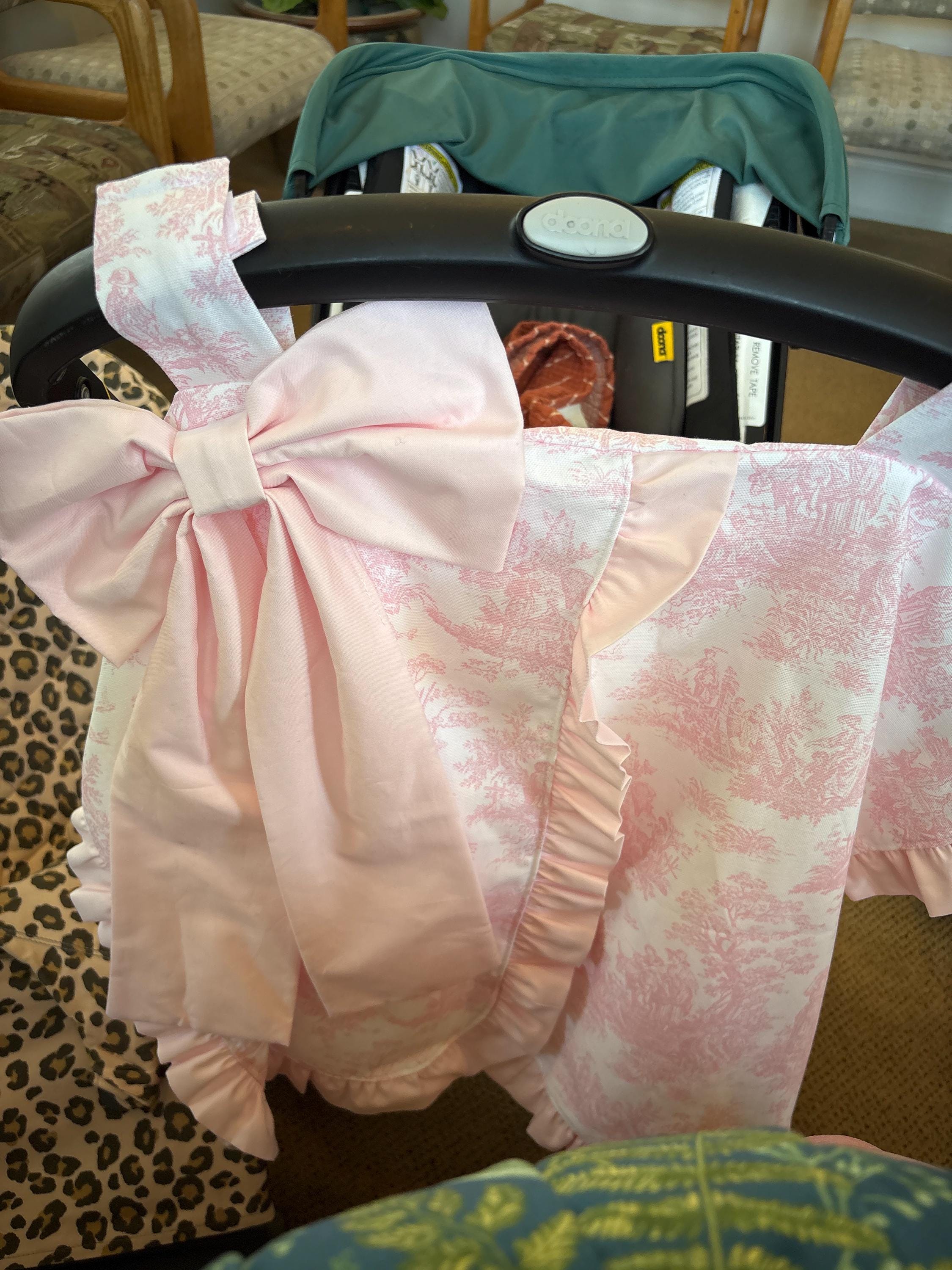 This car seat canopy features a chintz fabric in the color of your choice with a matching cotton ruffle and bow. You can personalize it with a three letter monogram or name on the bow. Contact us for custom designs.