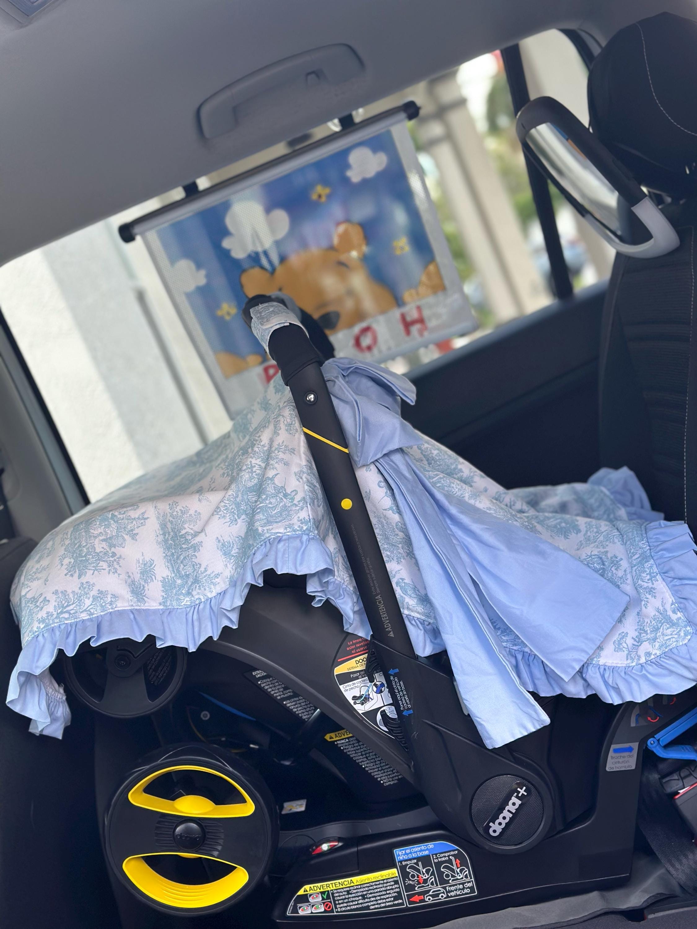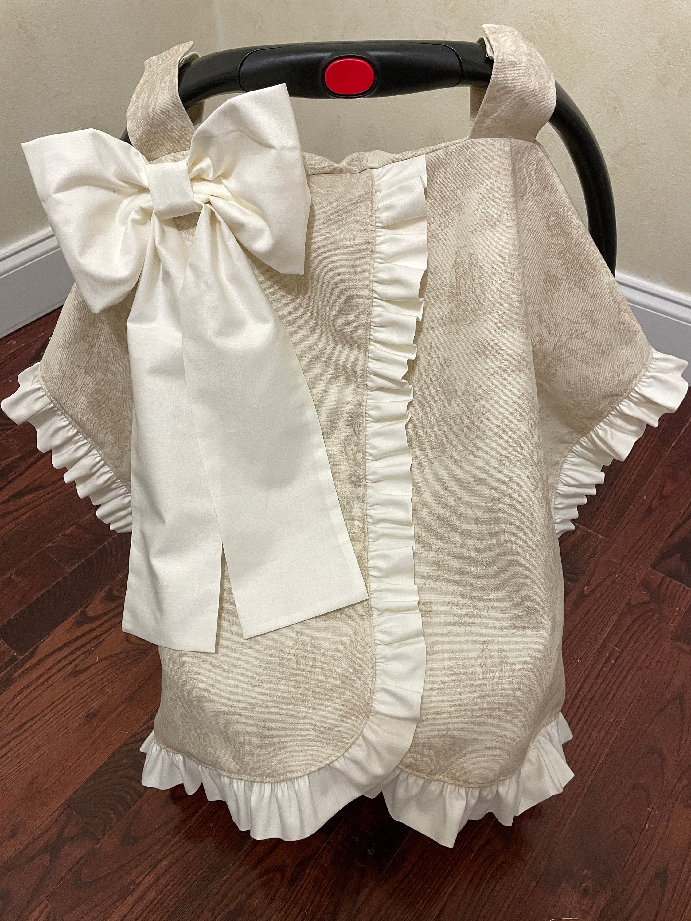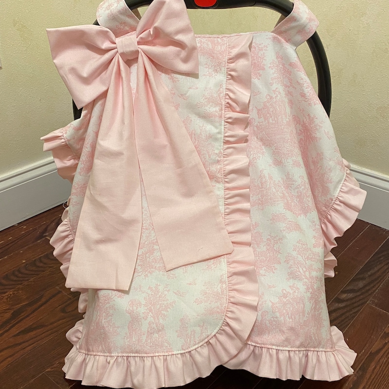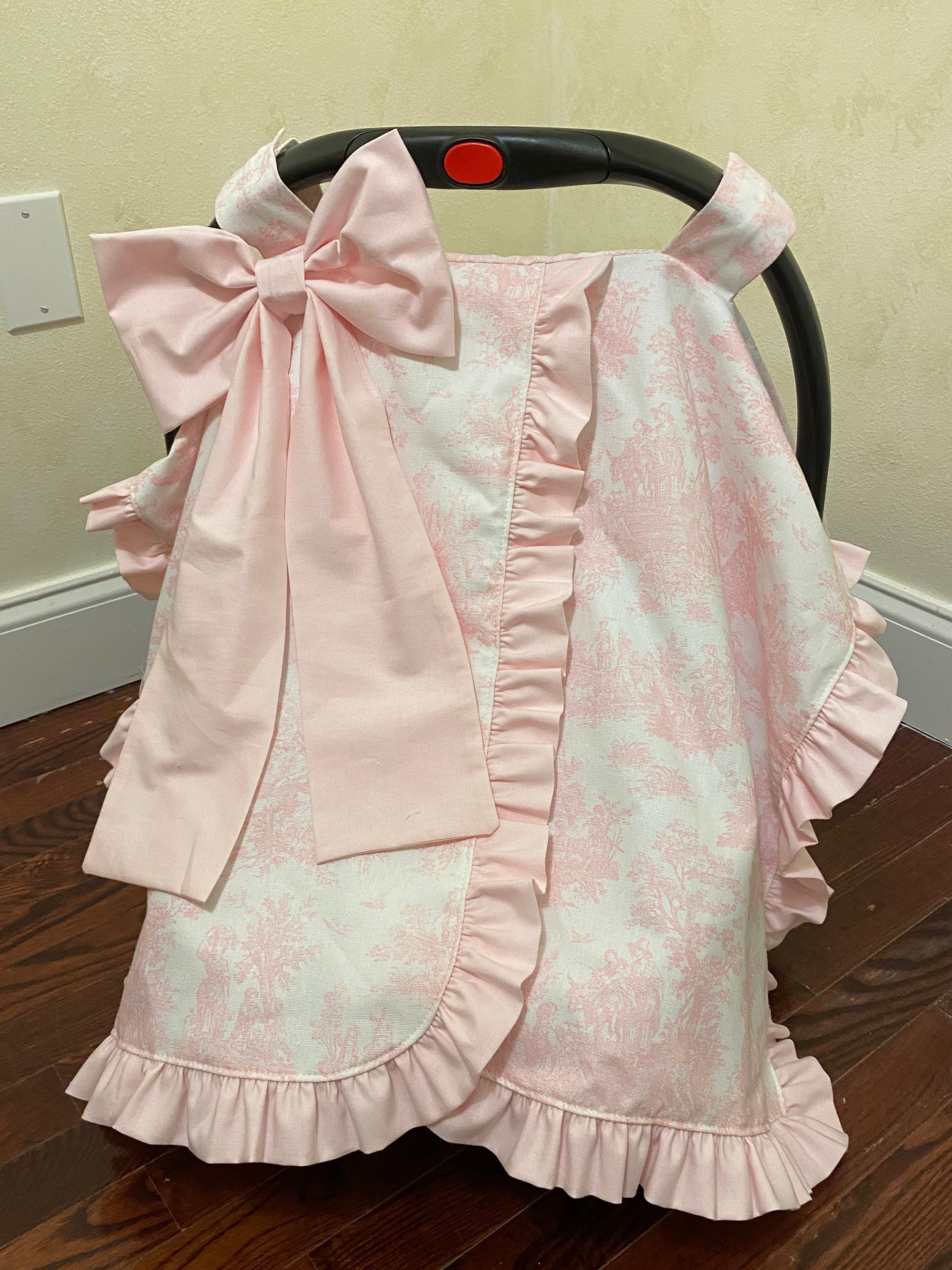 This car seat canopy features a chintz fabric in the color of your choice with a matching cotton ruffle and bow. You can personalize it with a three letter monogram or name on the bow. Contact us for custom designs.