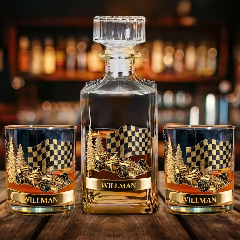 🥃 Custom Race Car Whiskey Bottle and Glass Set, Car Racing Barware Gift, Racing Whiskey Set for Men, Custom Driver Gift, Fast Car Lover Present