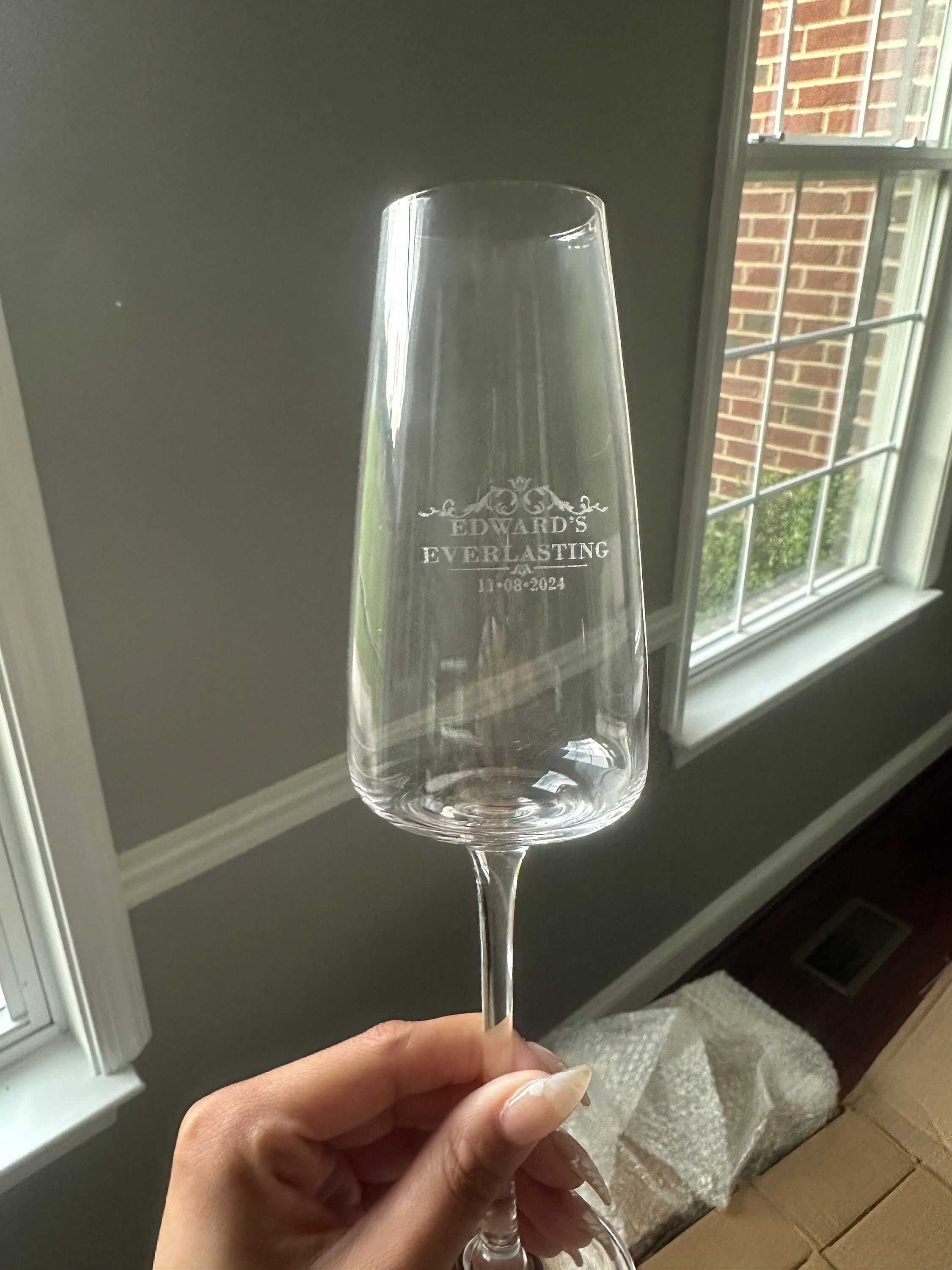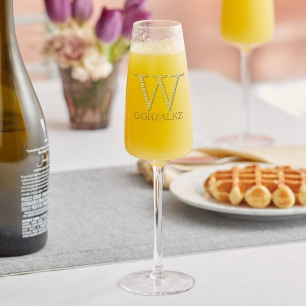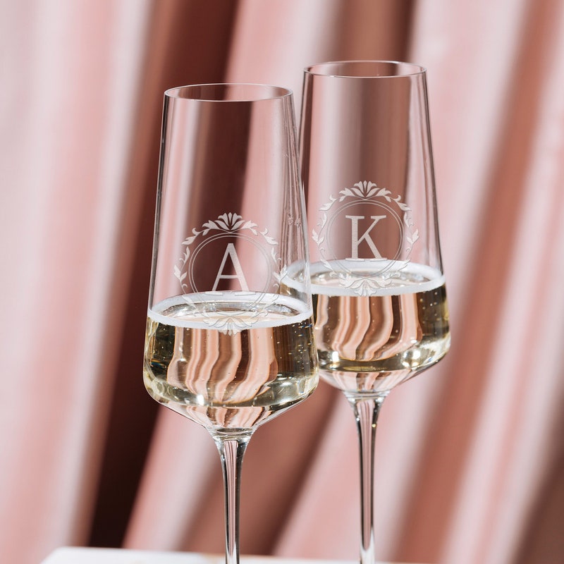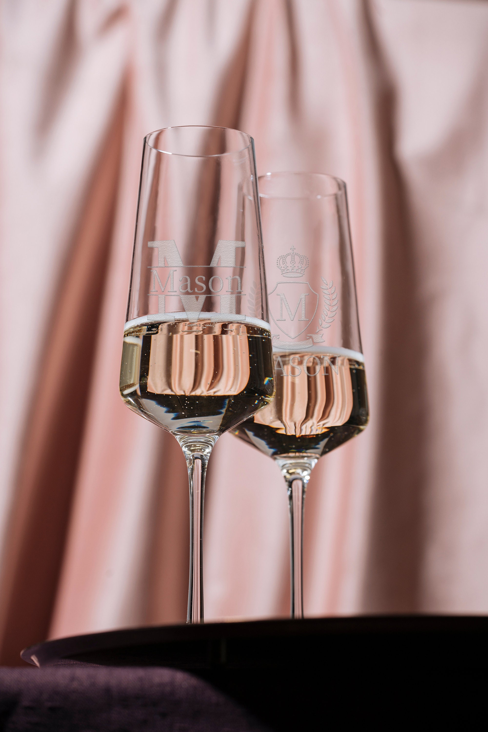 Custom Engraved - Elevate your wedding celebrations with these personalized champagne glasses that are engraved with a custom design or text, adding a touch of elegance and individuality to your special day. Choose from a selection of thirteen captivating designs to personalize your glasses, making them a truly unique reflection of your style and taste.
