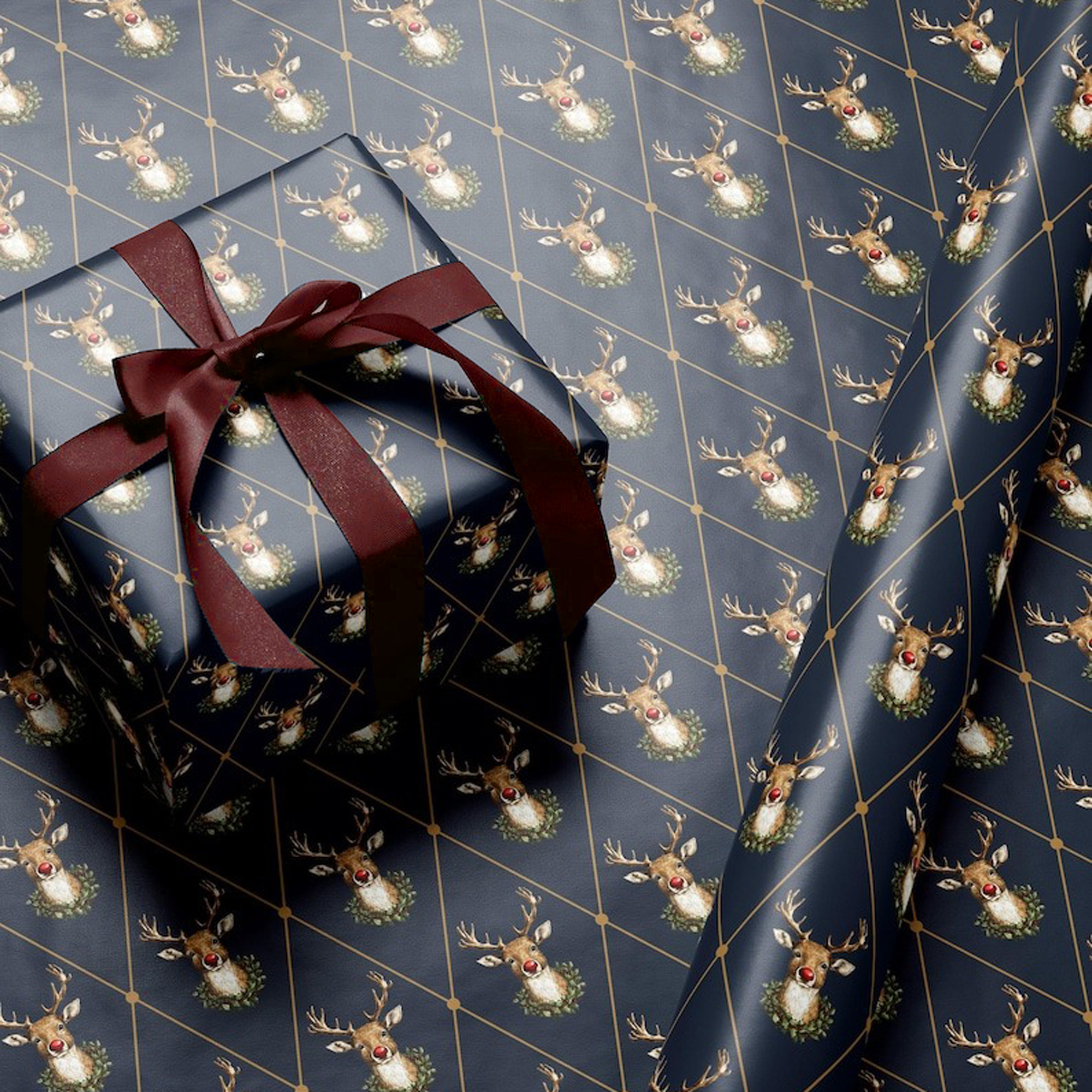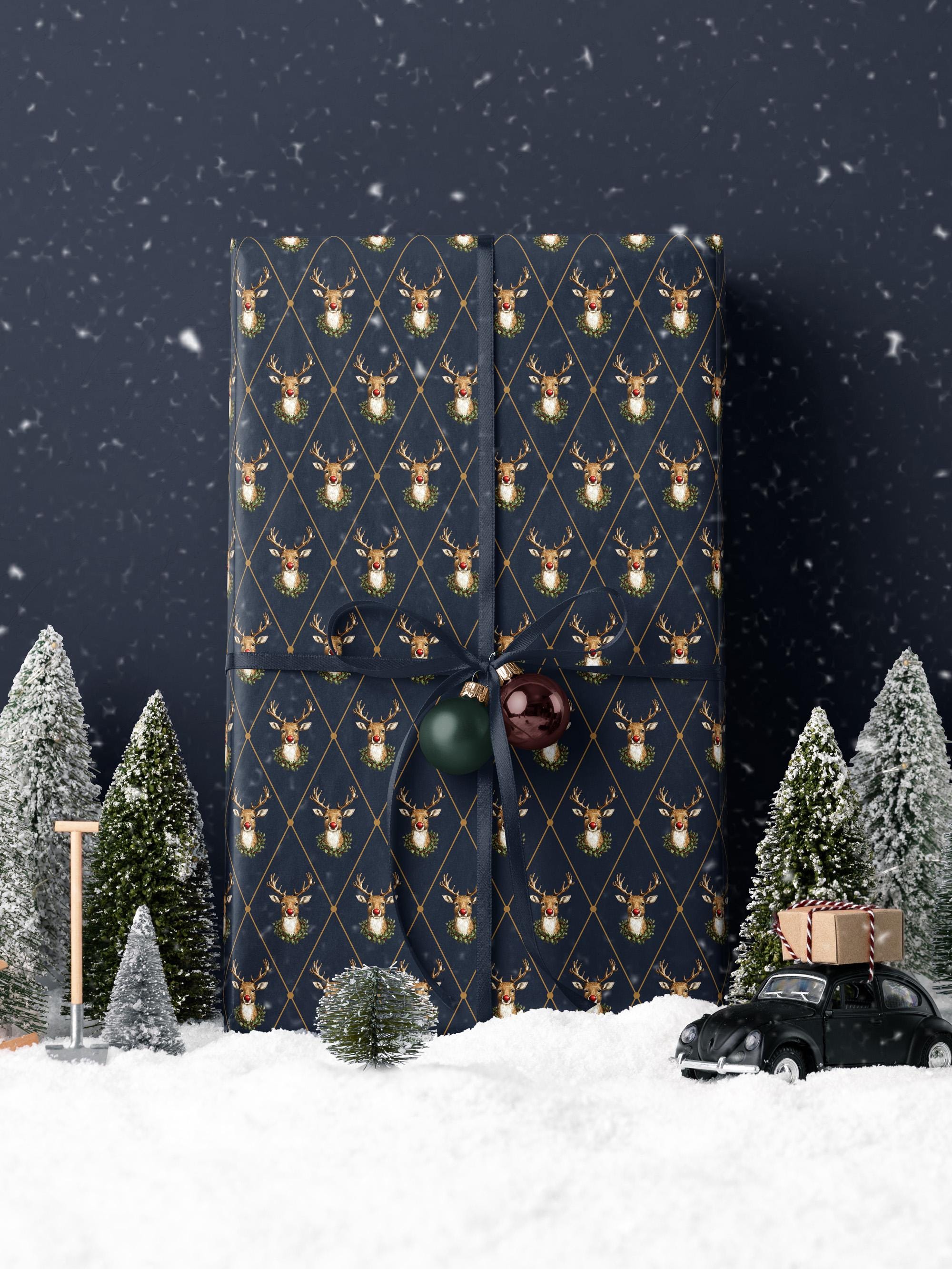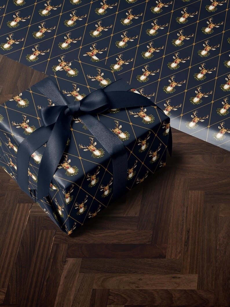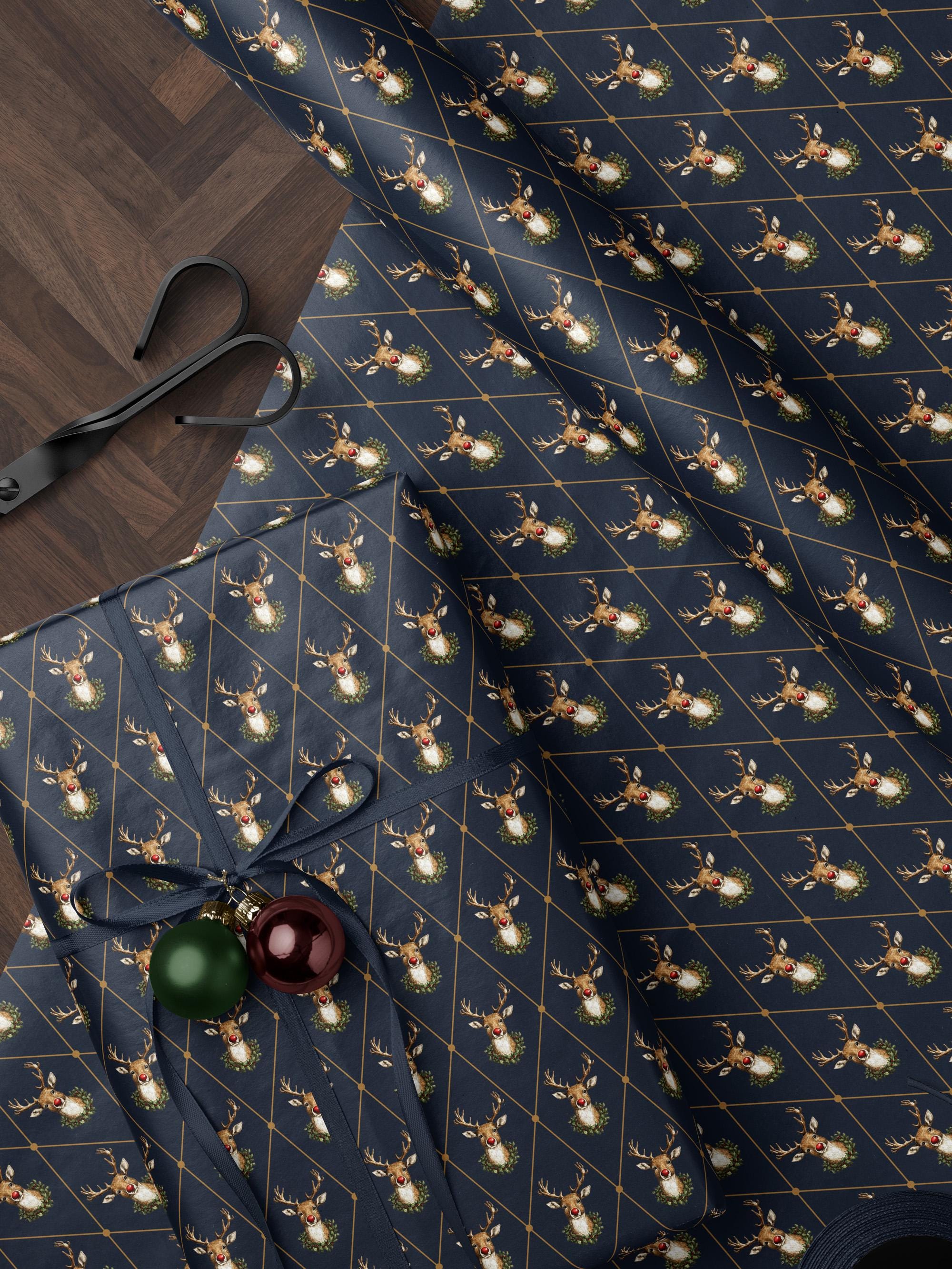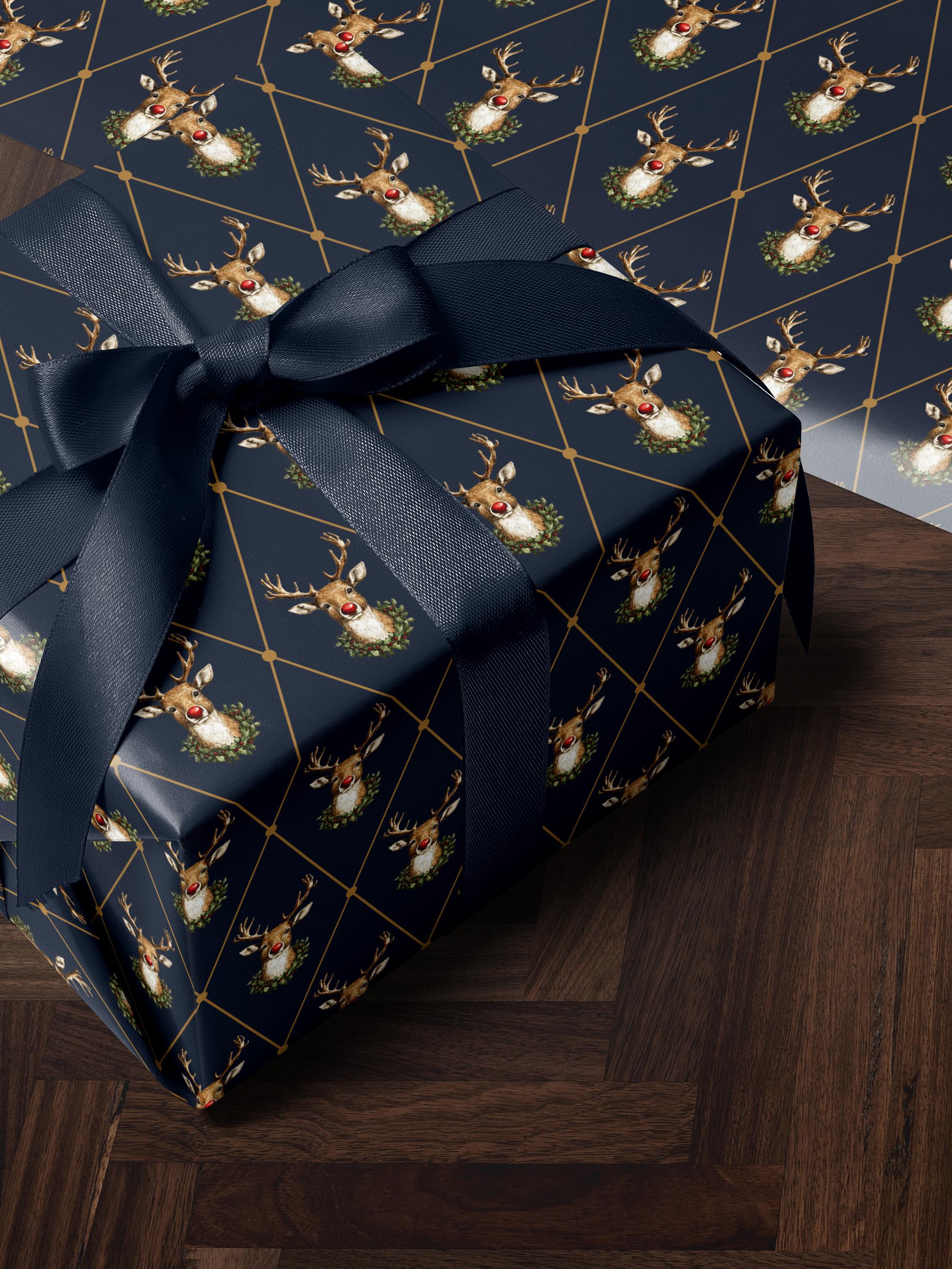 Our festive Reindeer Blue wrapping paper features a charming reindeer wearing a garland and gold accents on a dark blue background. Made from premium materials, this wrapping paper will add a touch of elegance to your holiday gifts and is guaranteed to look stunning.