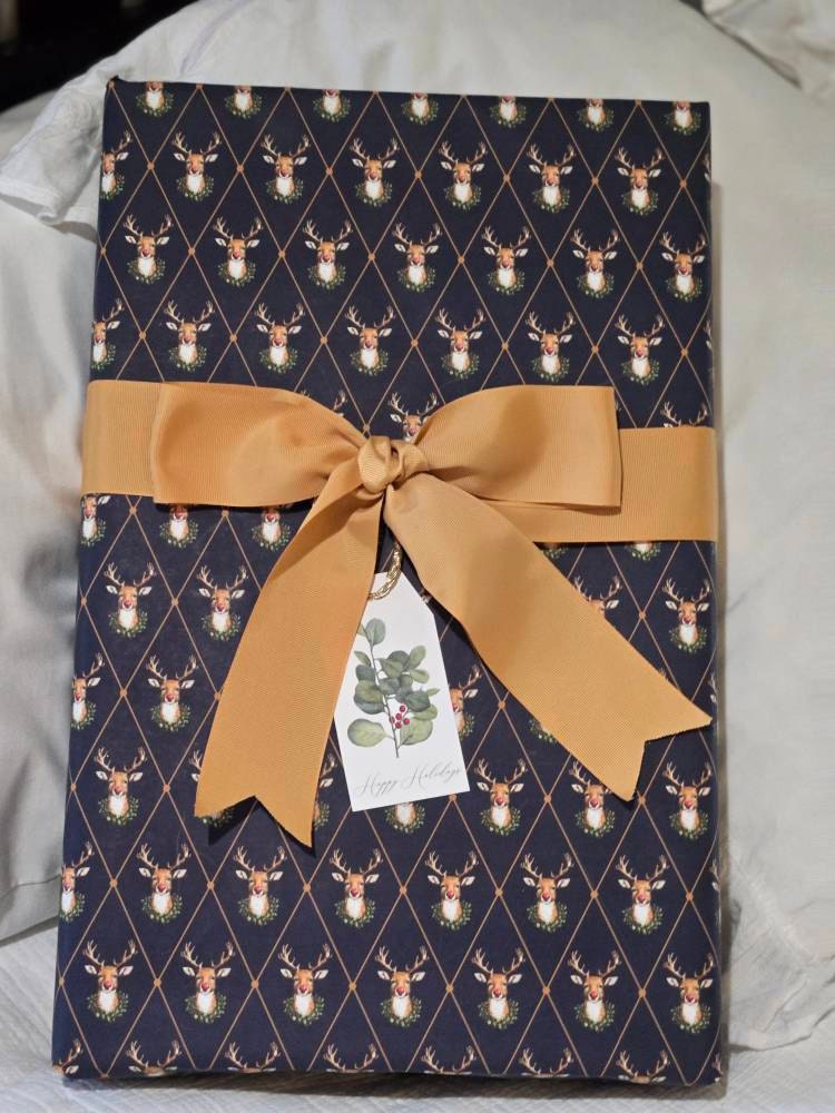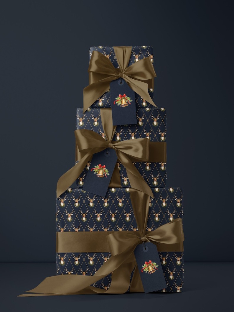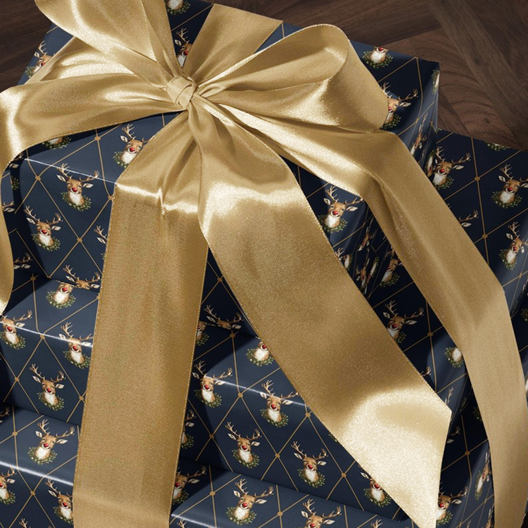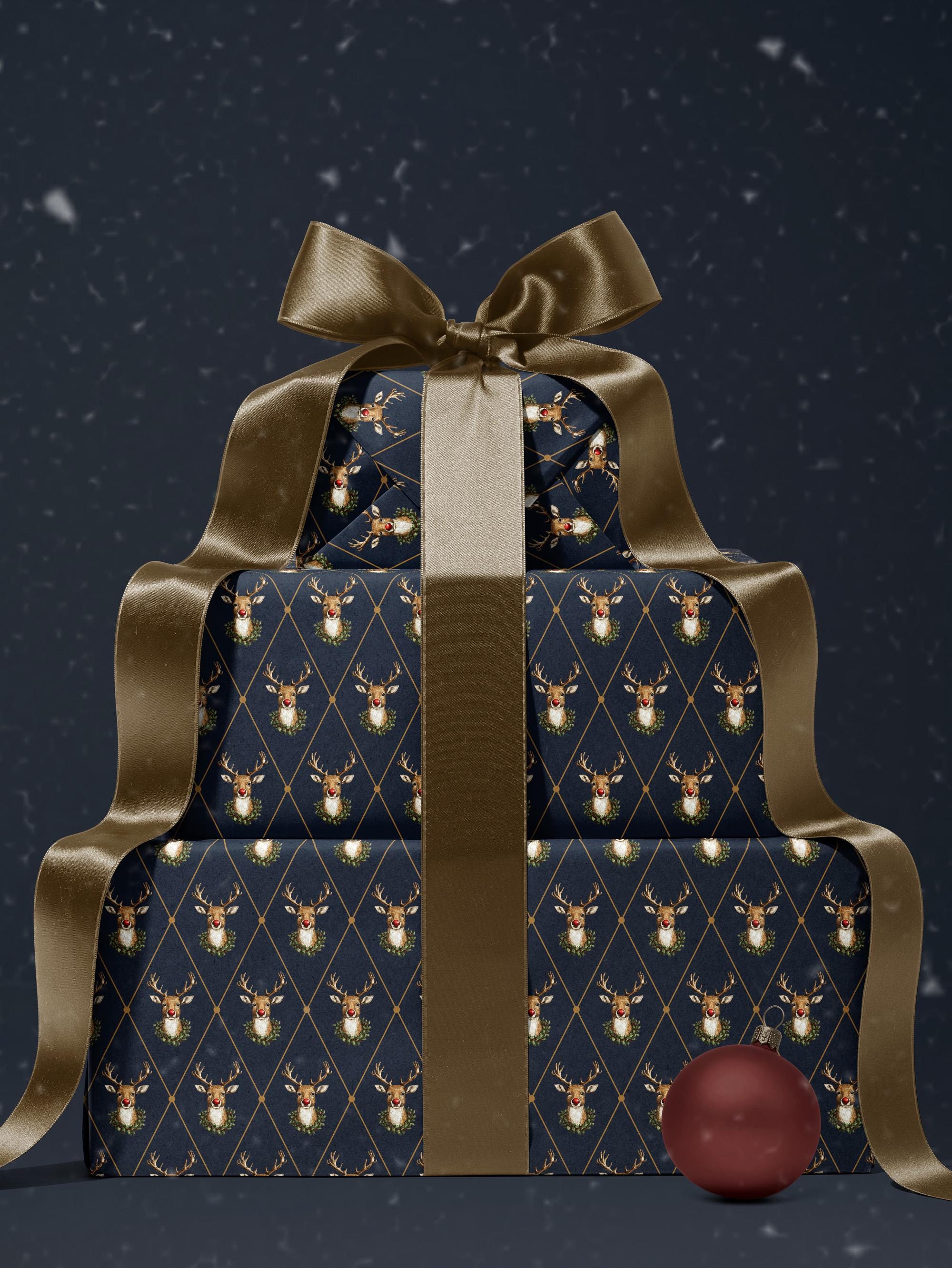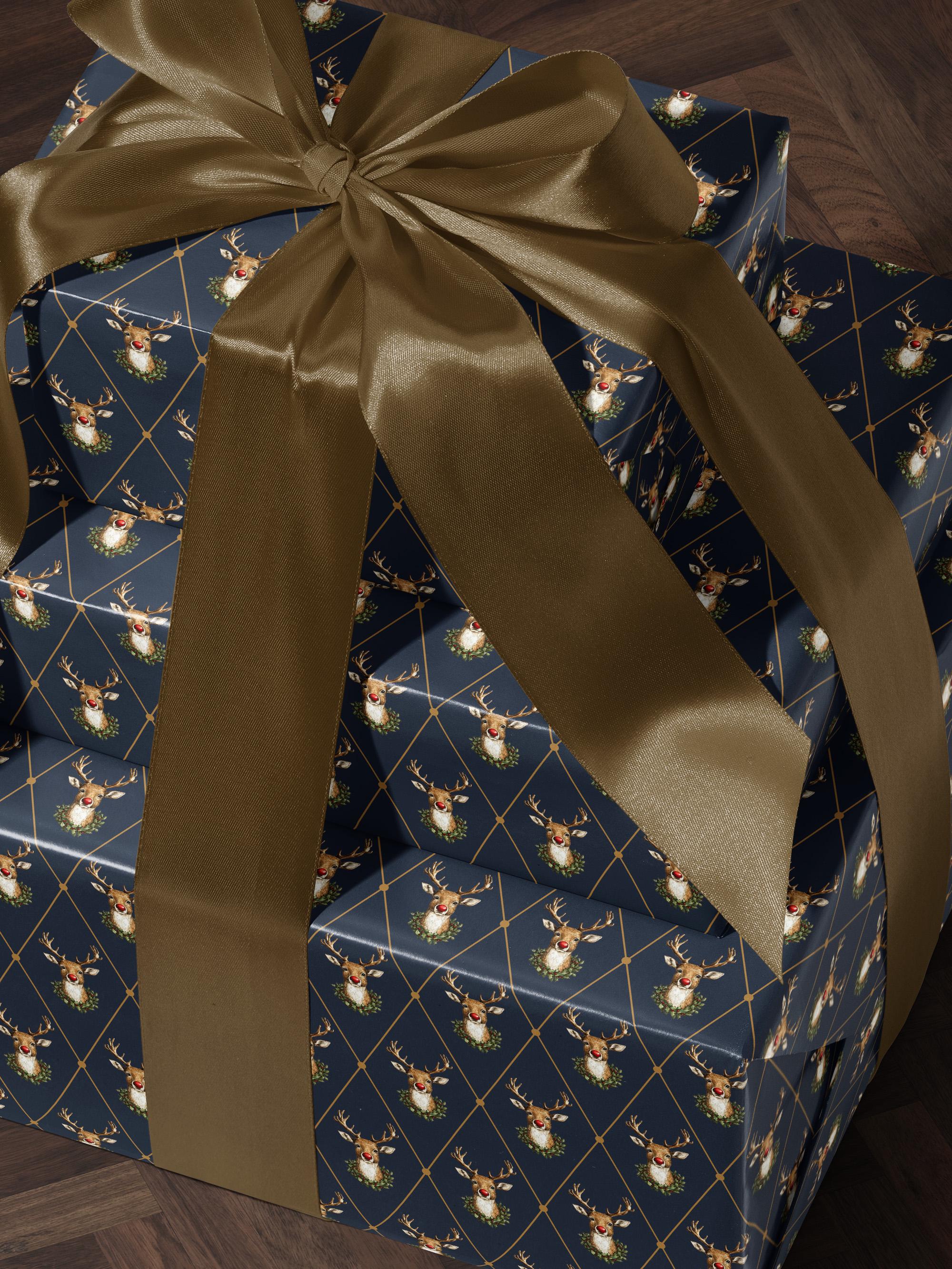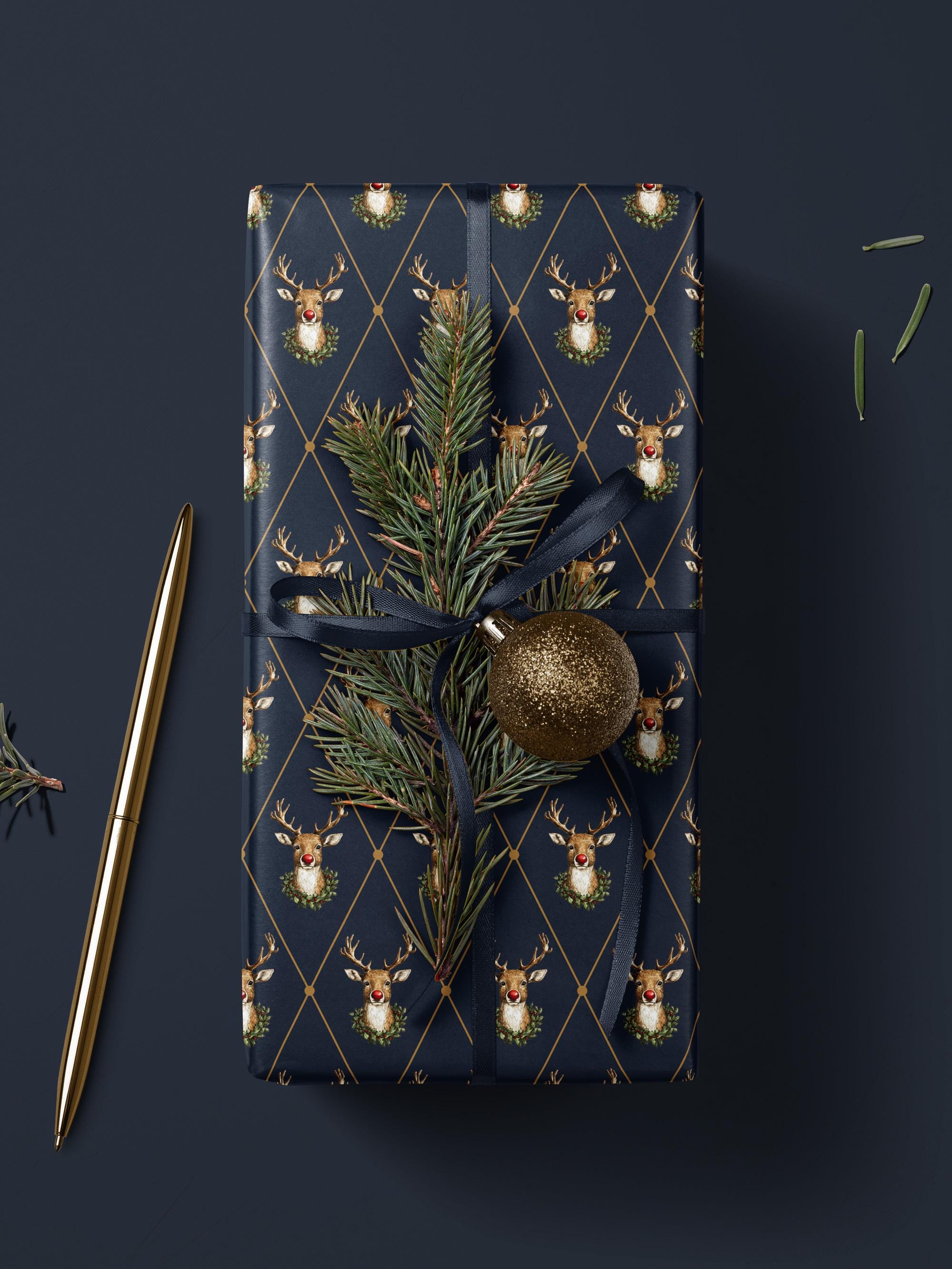 Our festive Reindeer Blue wrapping paper features a charming reindeer wearing a garland and gold accents on a dark blue background. Made from premium materials, this wrapping paper will add a touch of elegance to your holiday gifts and is guaranteed to look stunning.