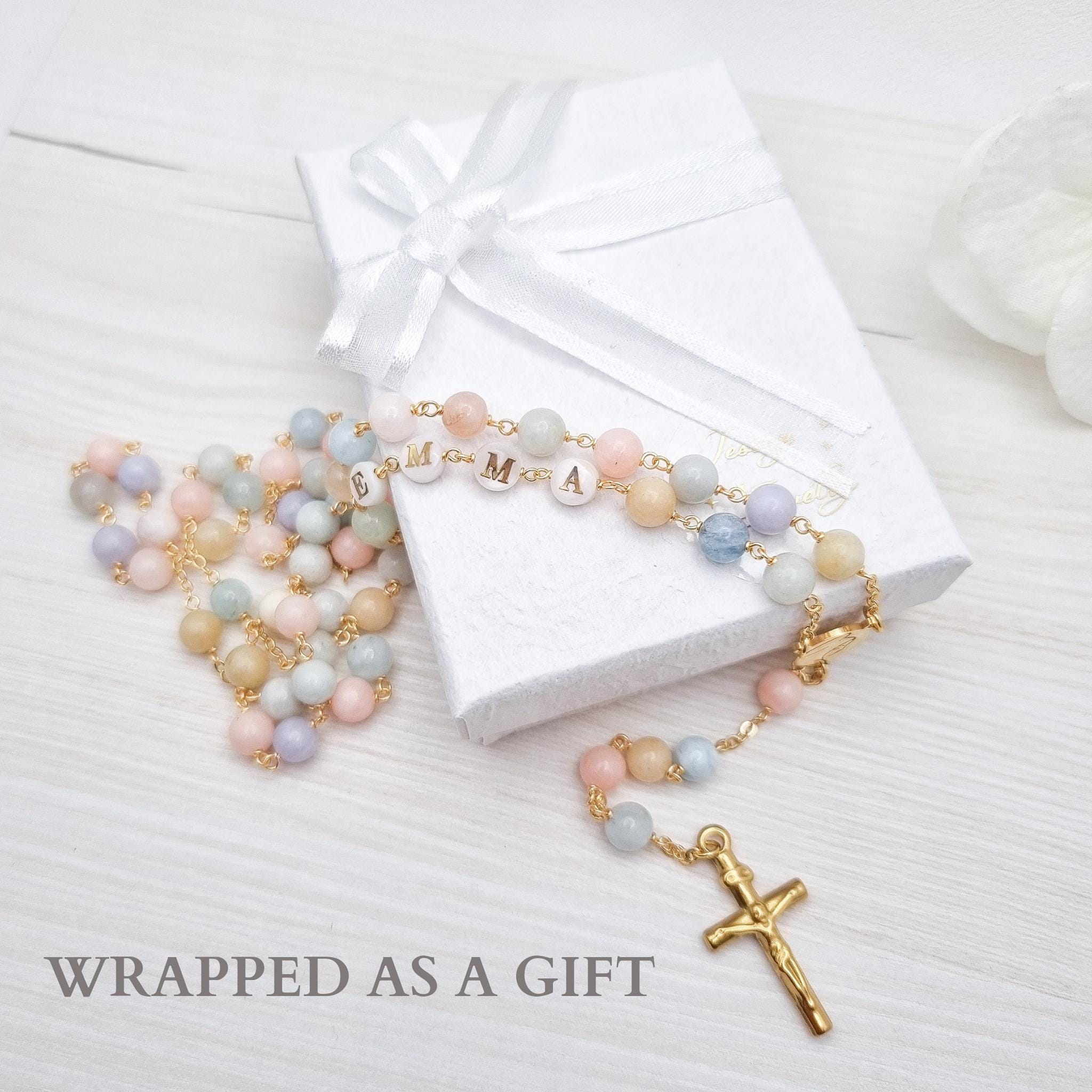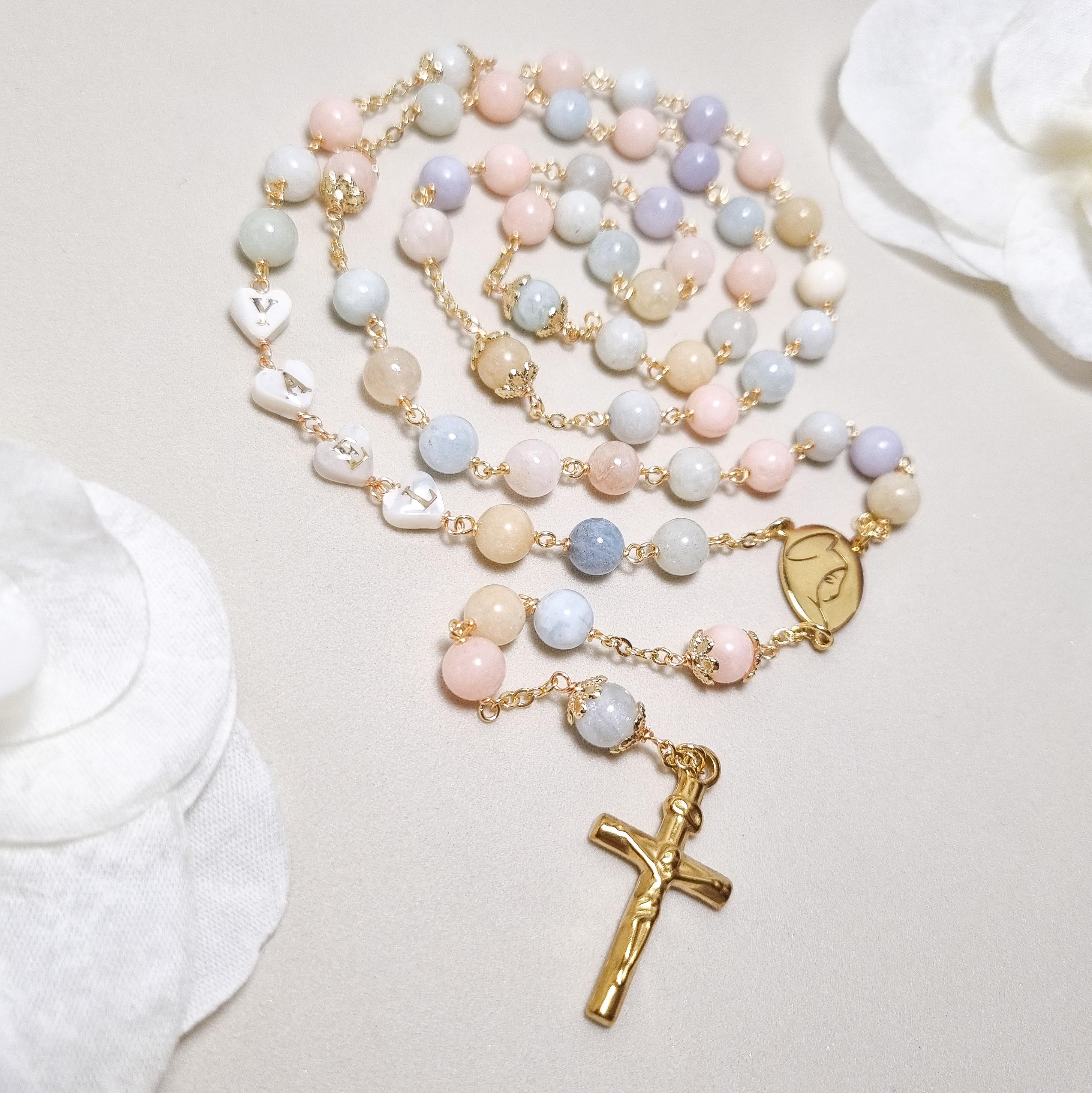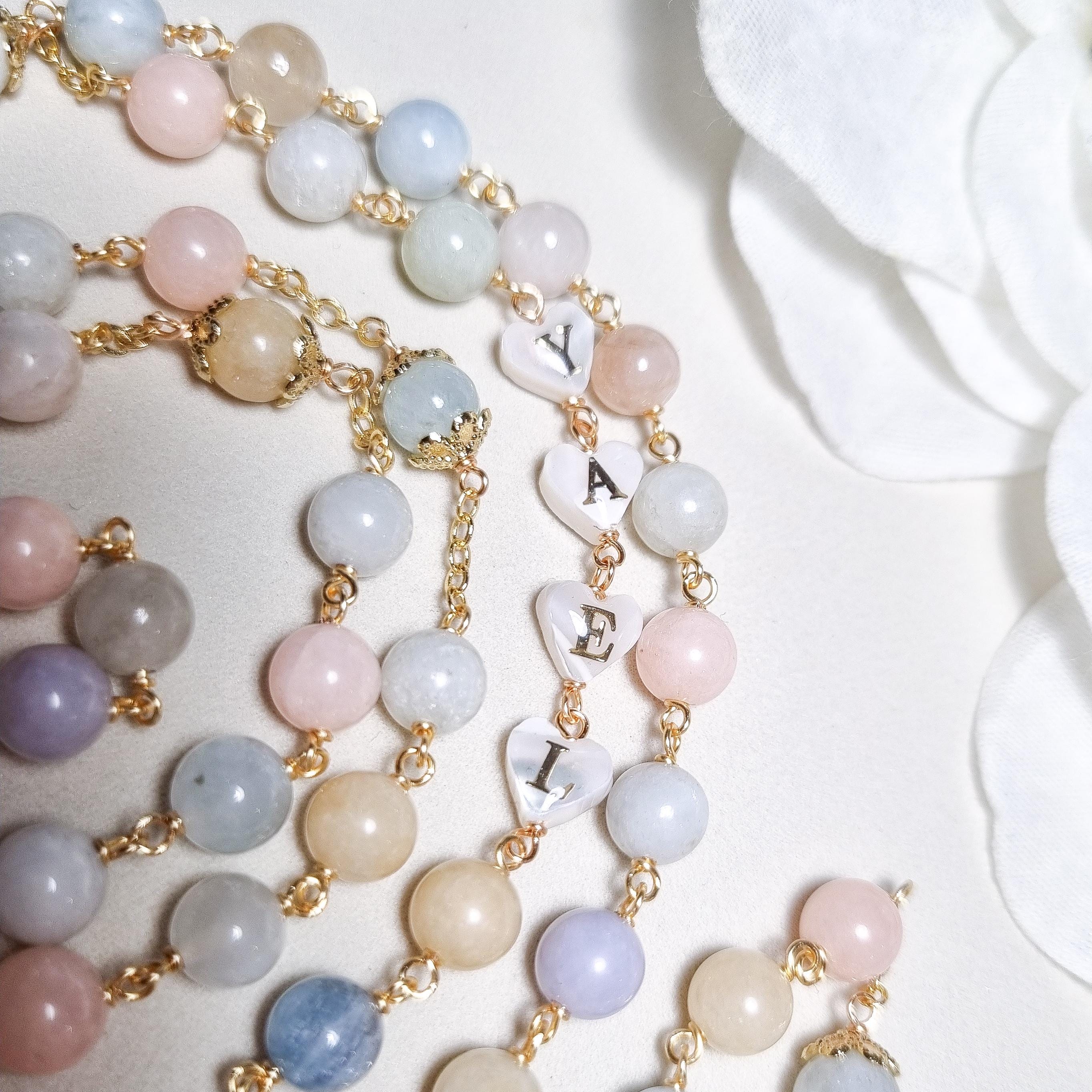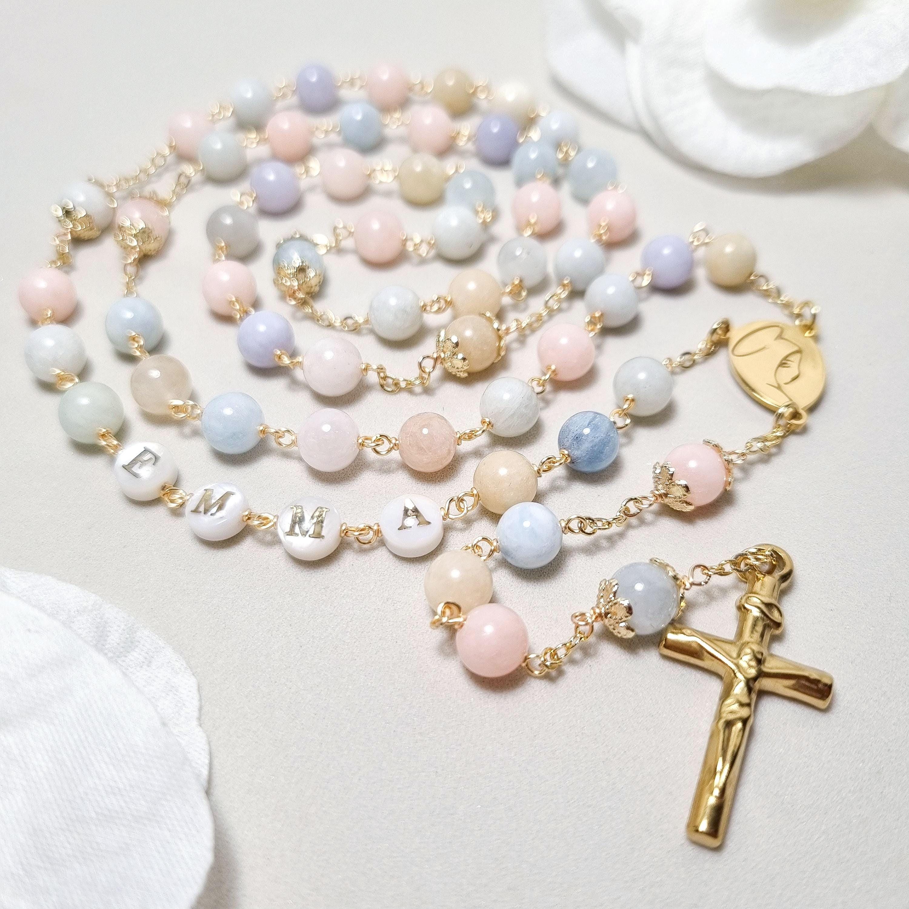 Personalized rosary, perfect as a baptism or first communion gift for a little girl, or as a gift for a special occasion. It is traditionally styled, using real beryls and gold plated brass wire, carefully handcrafted in a modern style, giving it a natural feel while also bringing a playful touch. The letter beads on the rosary are handcrafted from real mother of pearl, and the length is also perfect to wear as a delicate rosary necklace for women.