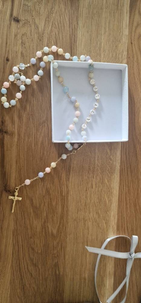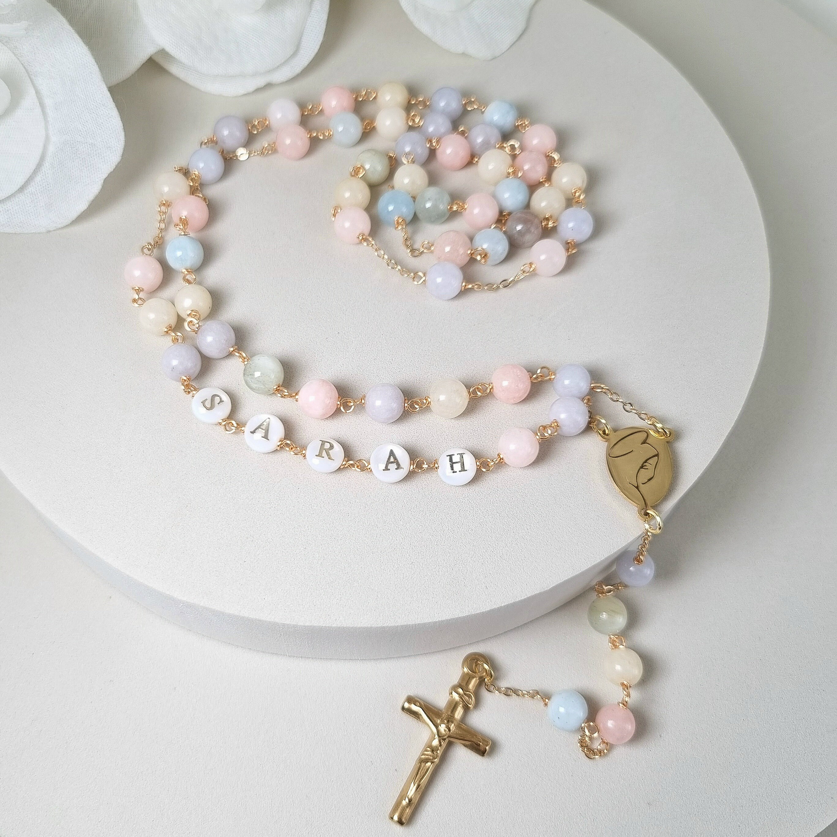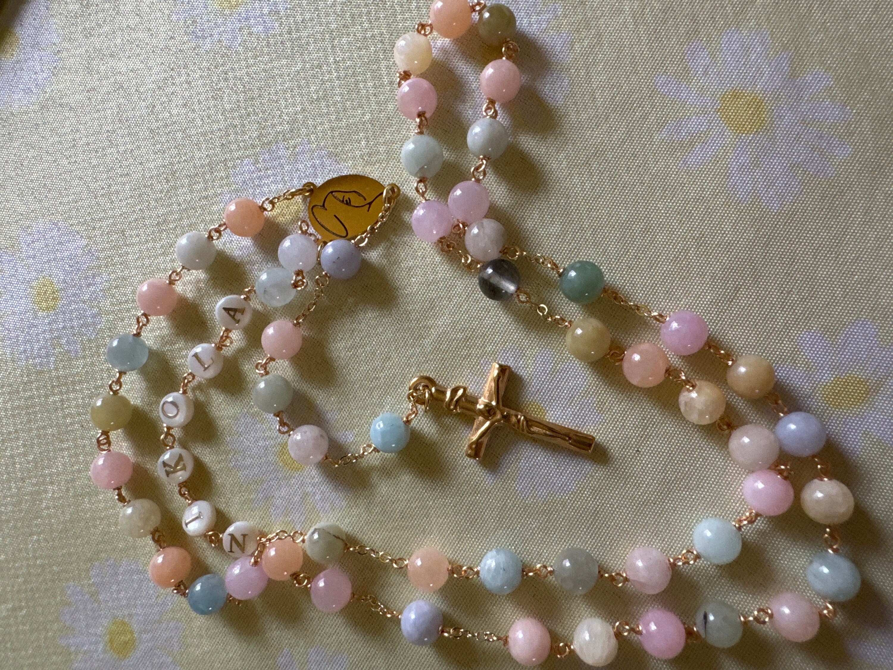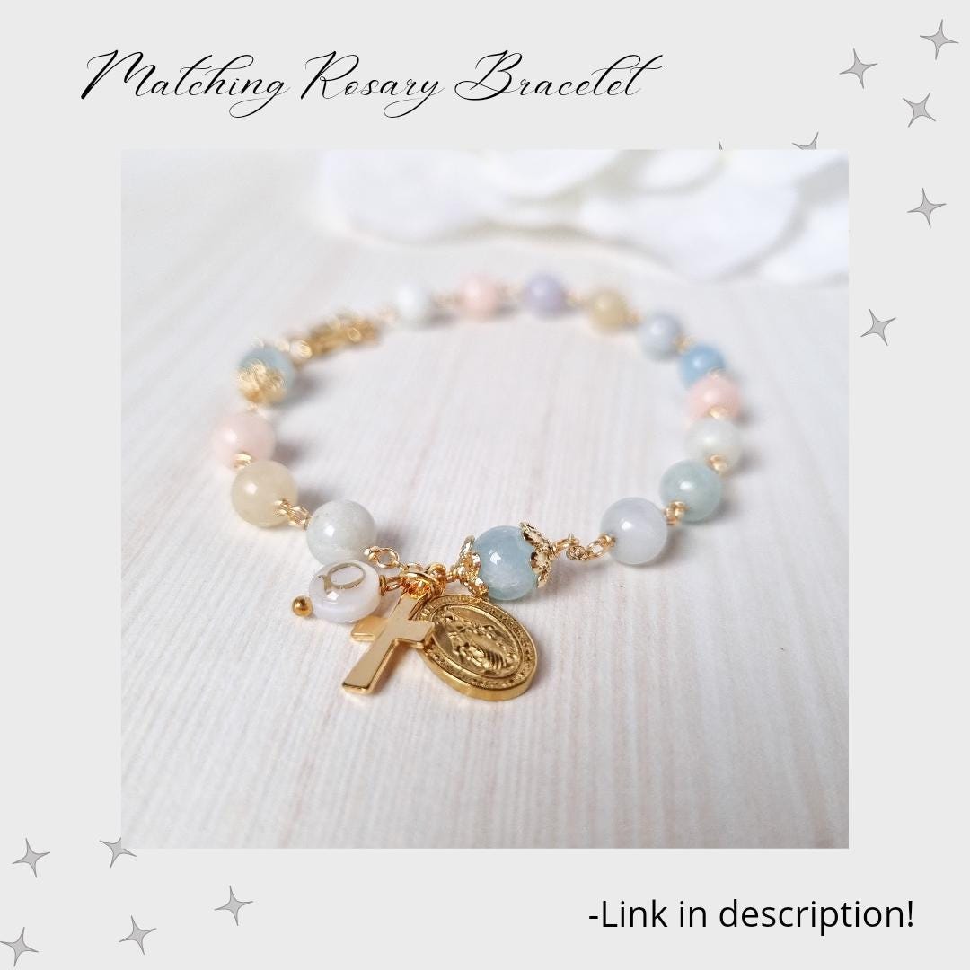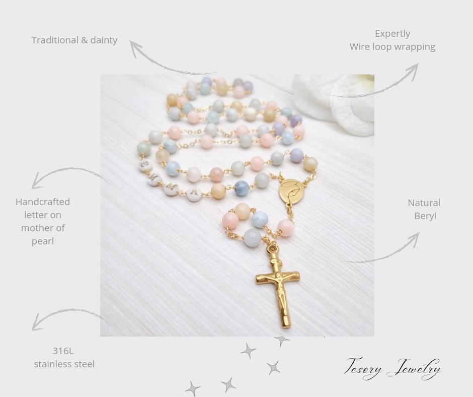 Personalized rosary, perfect as a baptism or first communion gift for a little girl, or as a gift for a special occasion. It is traditionally styled, using real beryls and gold plated brass wire, carefully handcrafted in a modern style, giving it a natural feel while also bringing a playful touch. The letter beads on the rosary are handcrafted from real mother of pearl, and the length is also perfect to wear as a delicate rosary necklace for women.