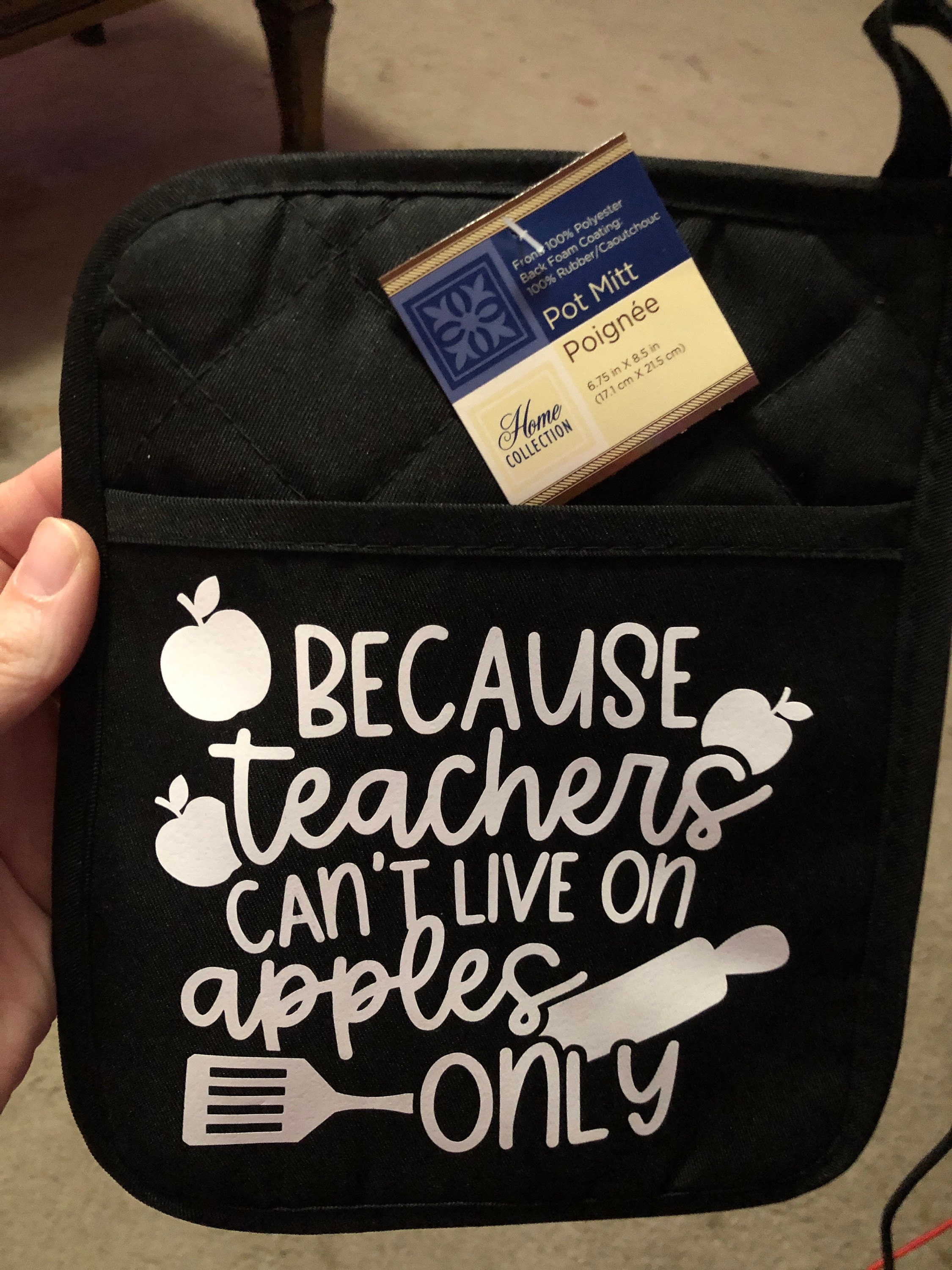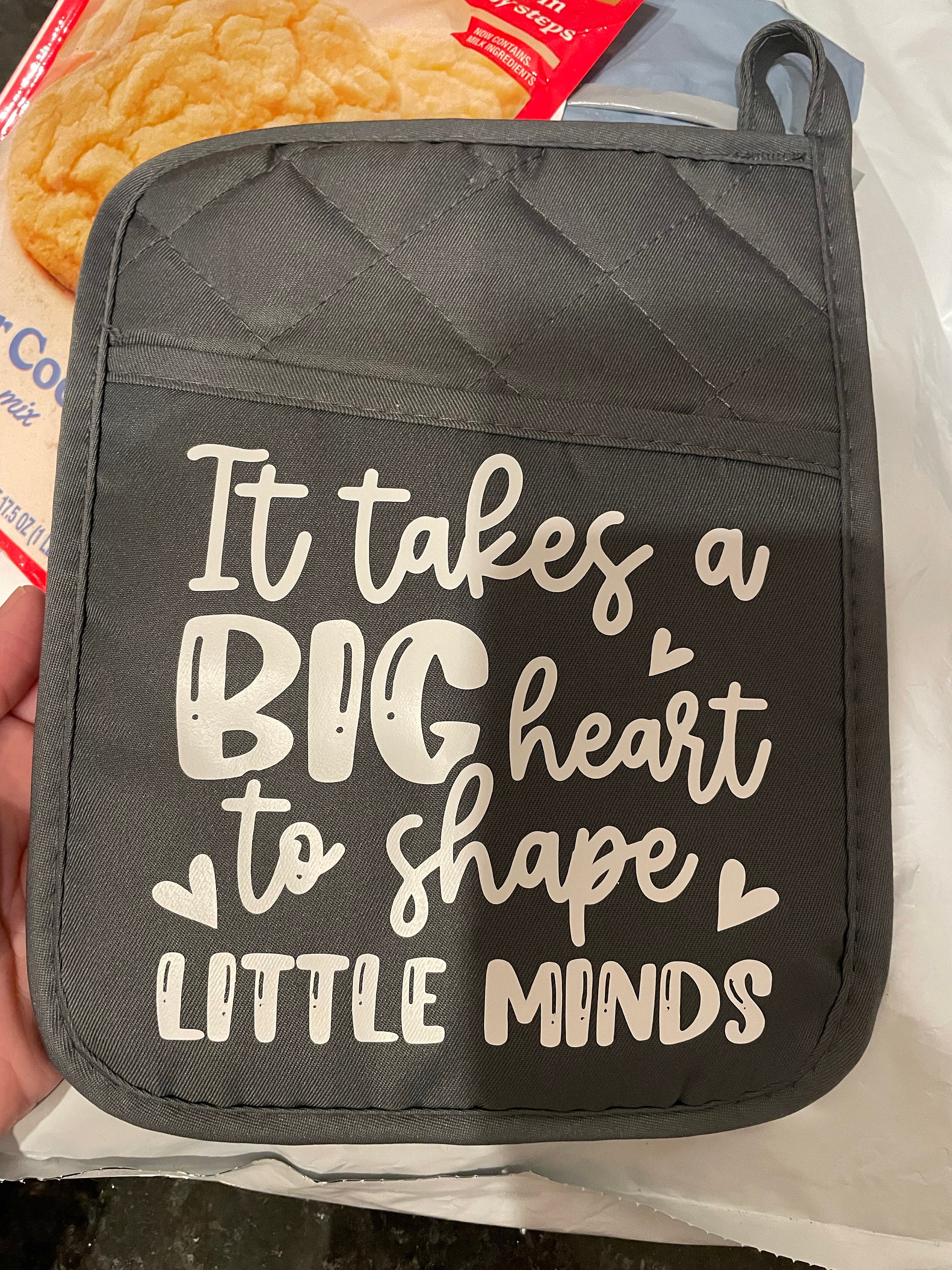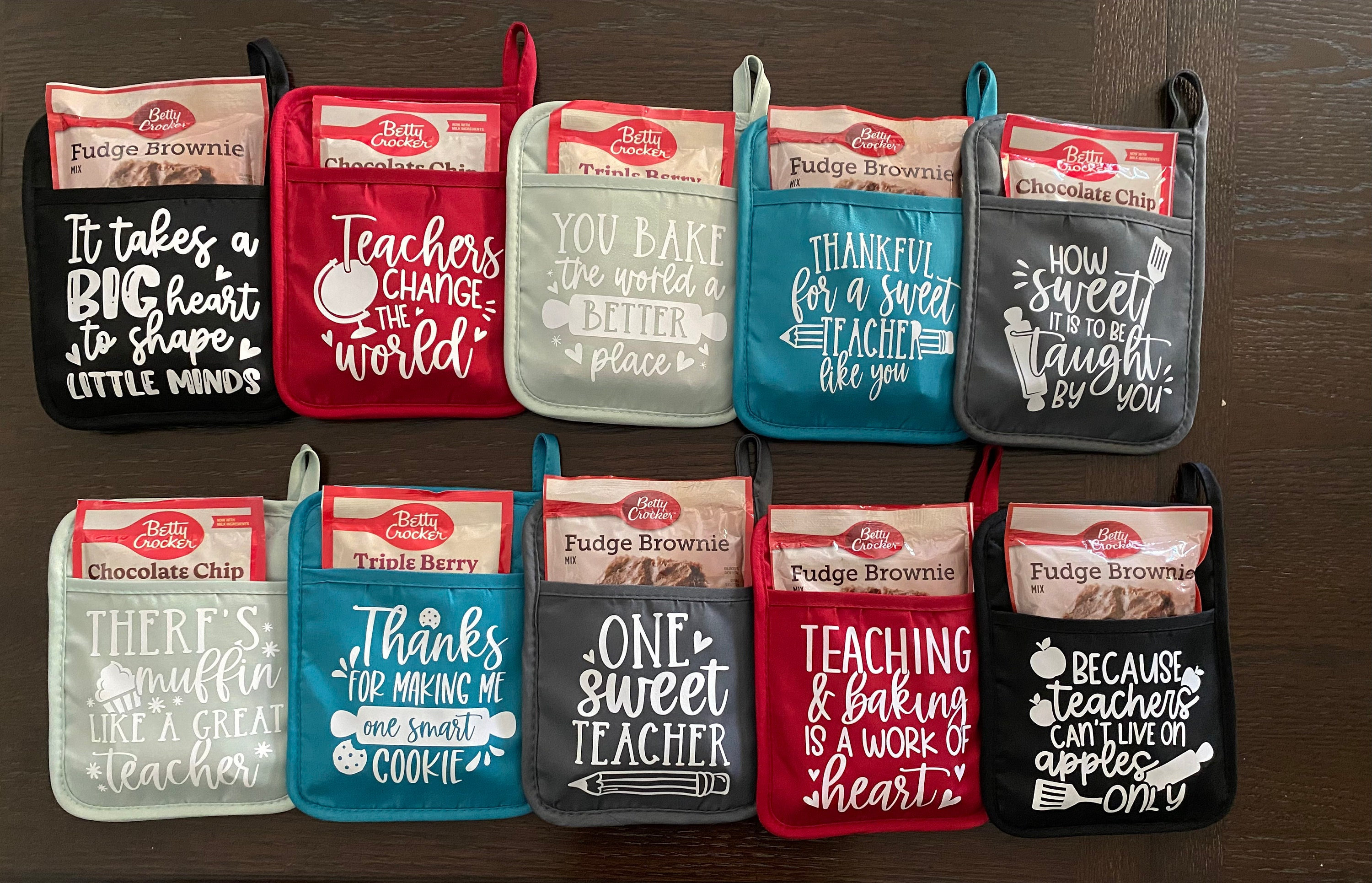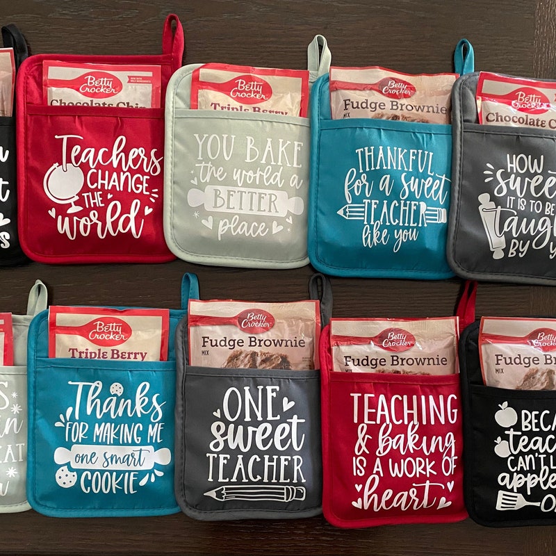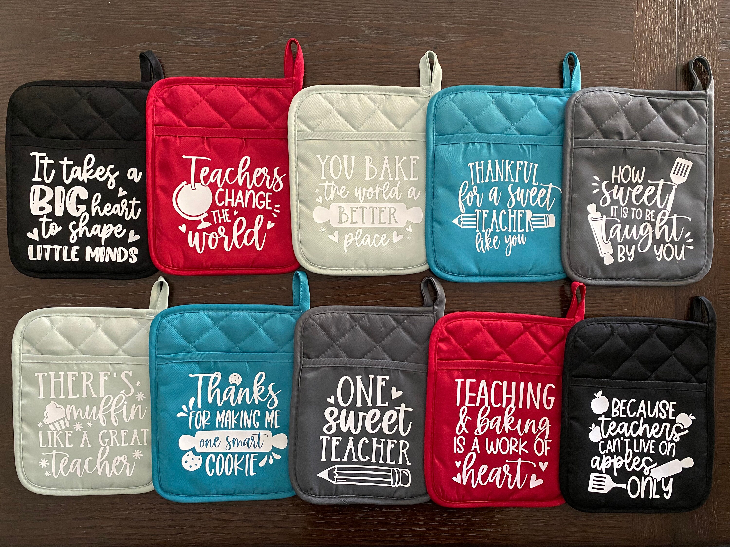 This is a perfect gift to say Thank You to all the hard working teachers or daycare workers. Potholder is made of polyester with a rubber backing for gripping hot pots and pans. Measurement size 7x9. Each pot holder has a pocket that is the perfect size to hold a sweet gift such as baked goods, cookie mix, baking utensils, etc.