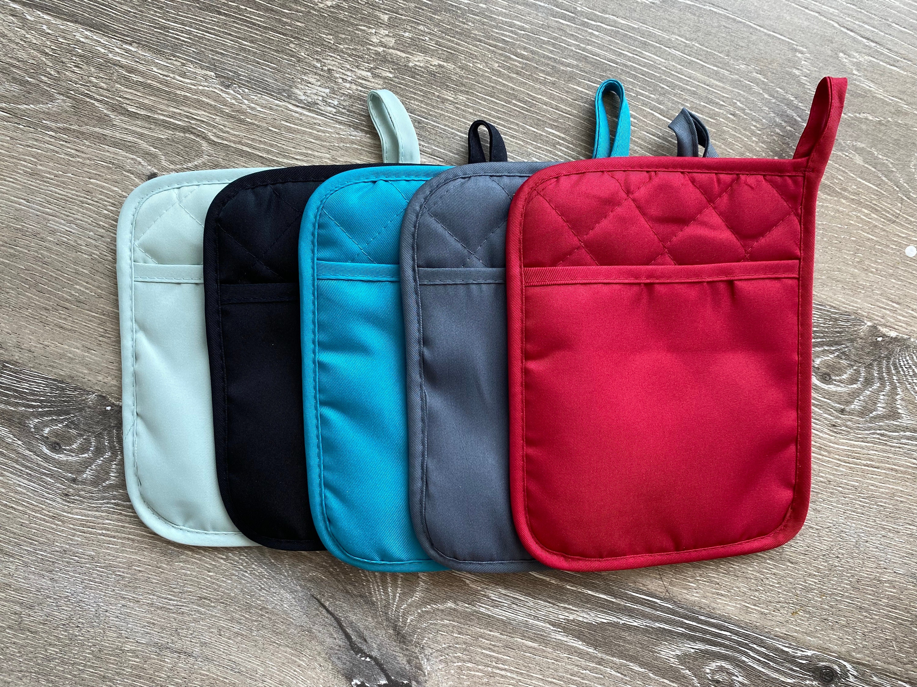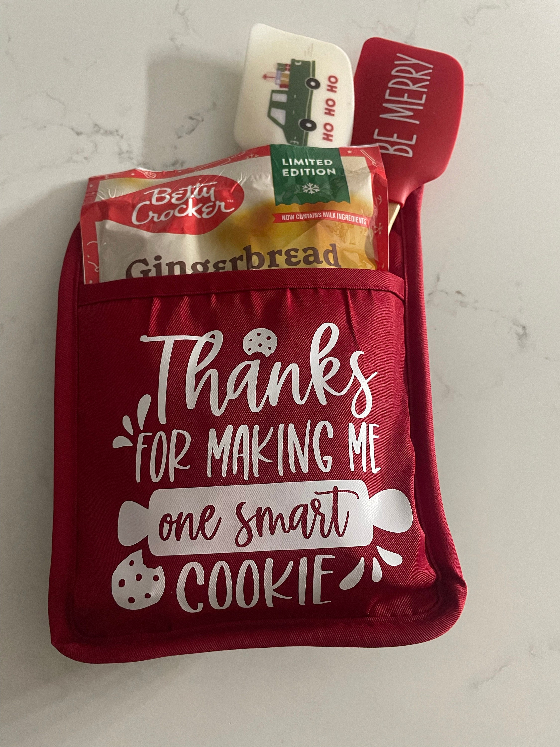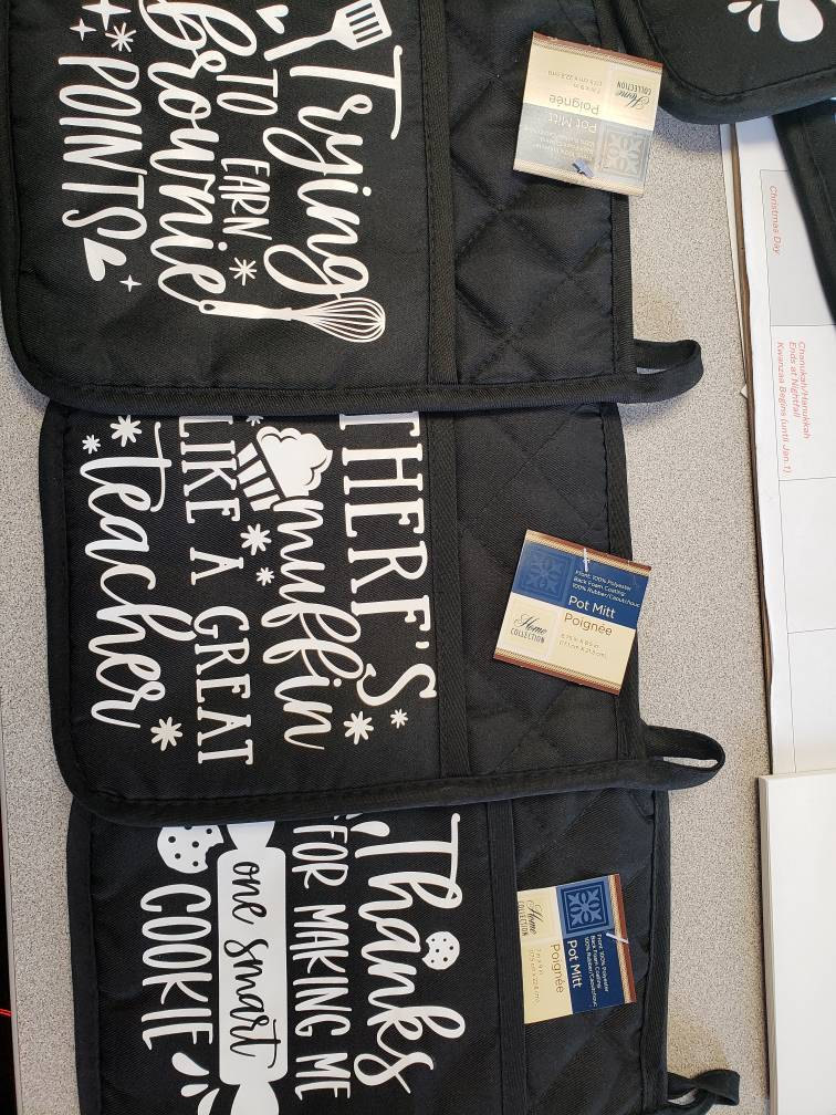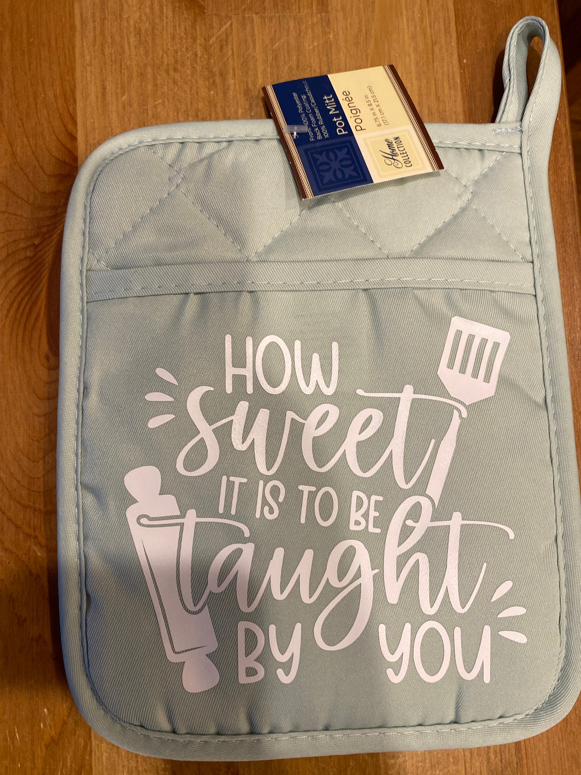 This is a perfect gift to say Thank You to all the hard working teachers or daycare workers. Potholder is made of polyester with a rubber backing for gripping hot pots and pans. Measurement size 7x9. Each pot holder has a pocket that is the perfect size to hold a sweet gift such as baked goods, cookie mix, baking utensils, etc.